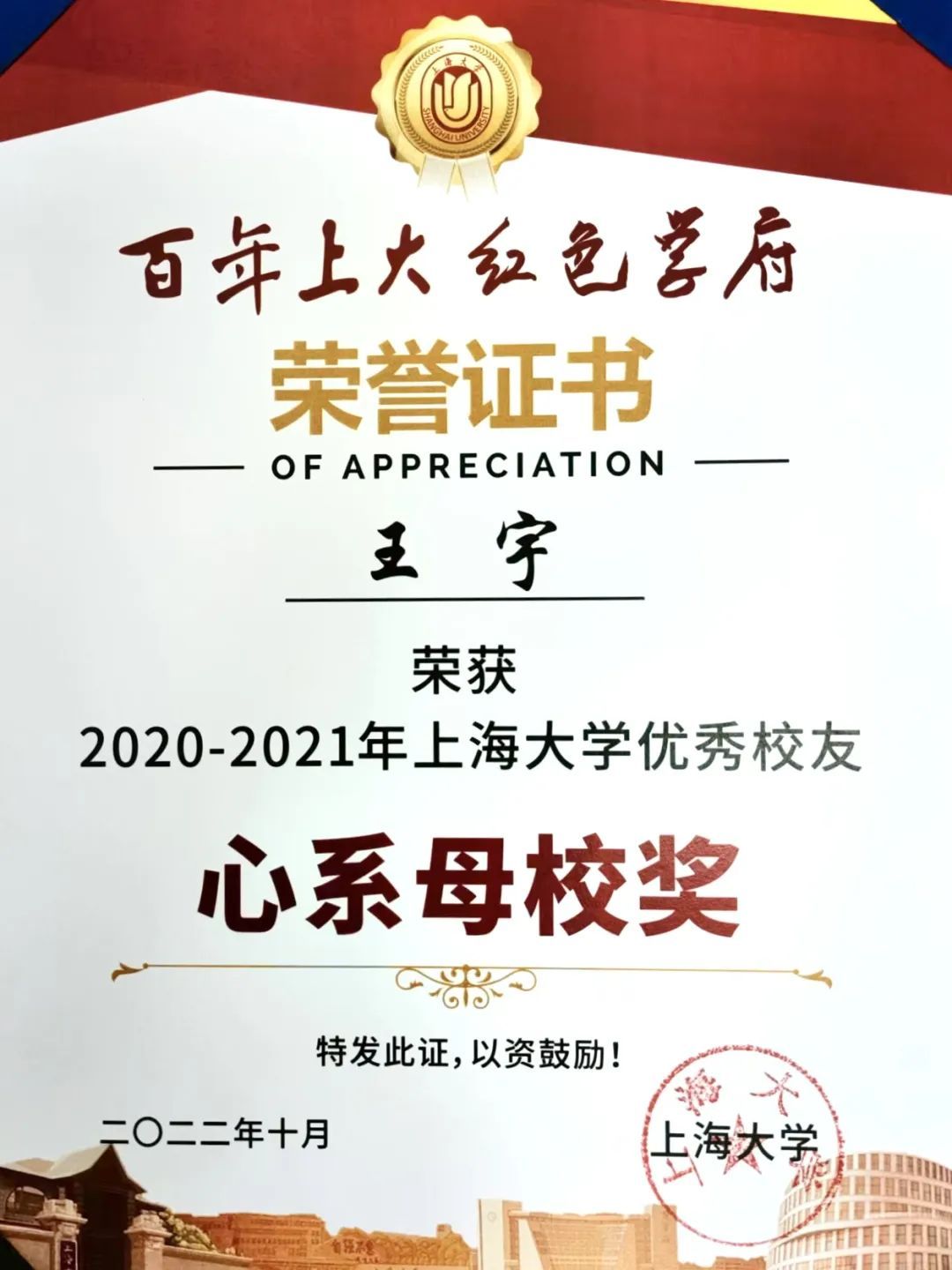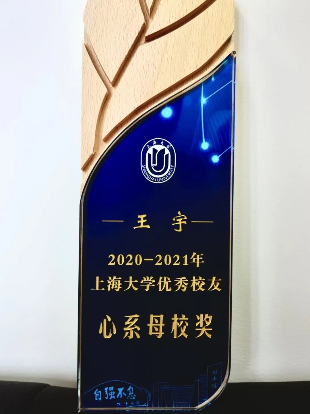王宇荣获母校颁发的奖项
