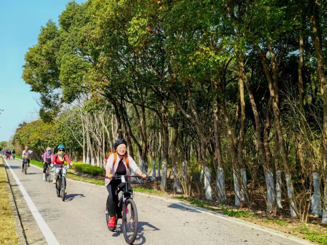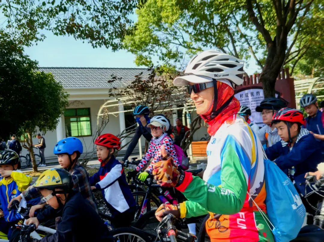 骑行团领队周绍辉介绍,骑行路上,队伍首尾安排了专业教练保驾护航,提供设备、技术指导等服务。骑行线路设计也颇有巧思,除了自然生态风光,还途经新源村村史馆、江南第一松所在地等石湖荡镇历史文化点位。