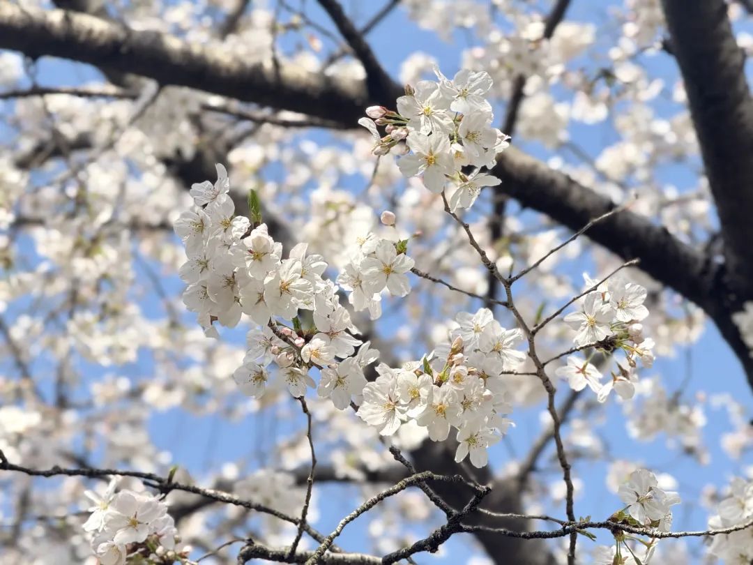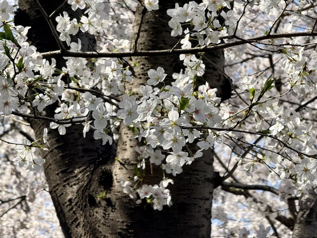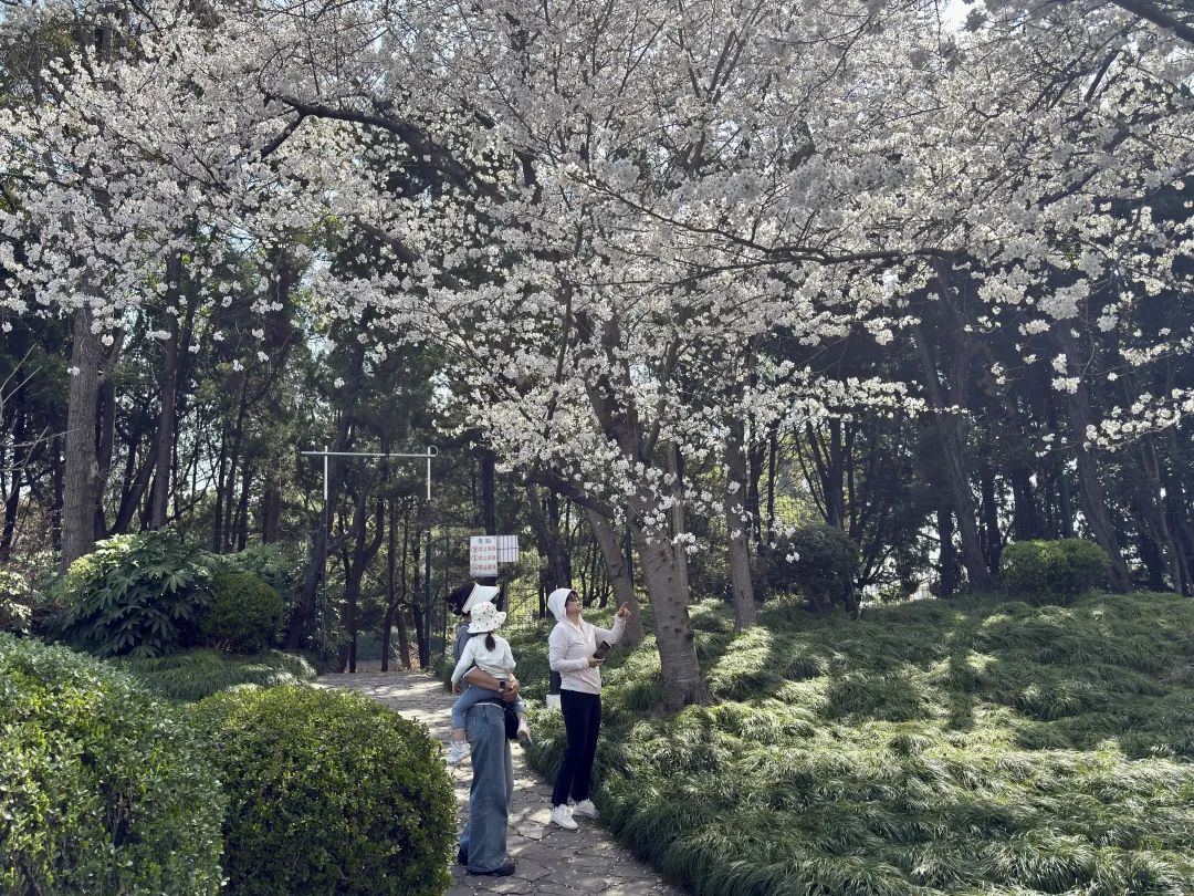 园内的樱花树大多有十几年的树龄,其中靠近马路的两棵,树干有十多米高,长得尤其好。游客们在花下穿行,或拍照留念,或静坐赏花,尽享这份春日的静谧与美好,欢声笑语在花间回荡。