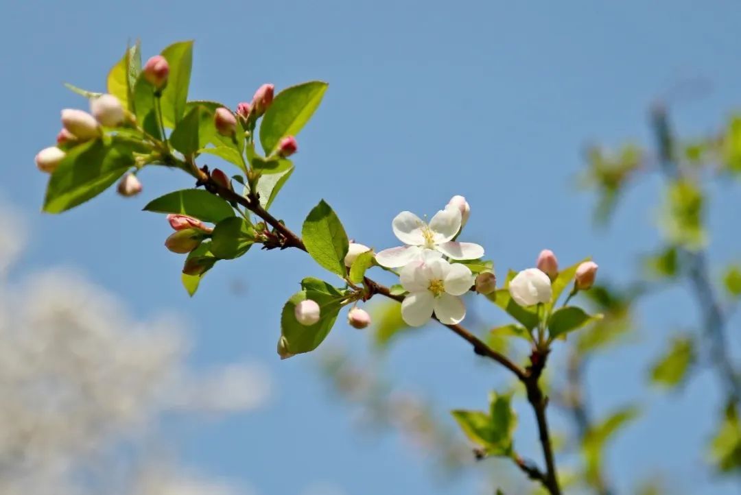 眼下,公园里的垂丝海棠也感受到了春天的气息,红白相间的花朵如同胭脂点缀在枝头,花色或浓或淡,与一旁的樱花树相映成趣,别有一番风味,吸引着人们纷纷驻足流连。