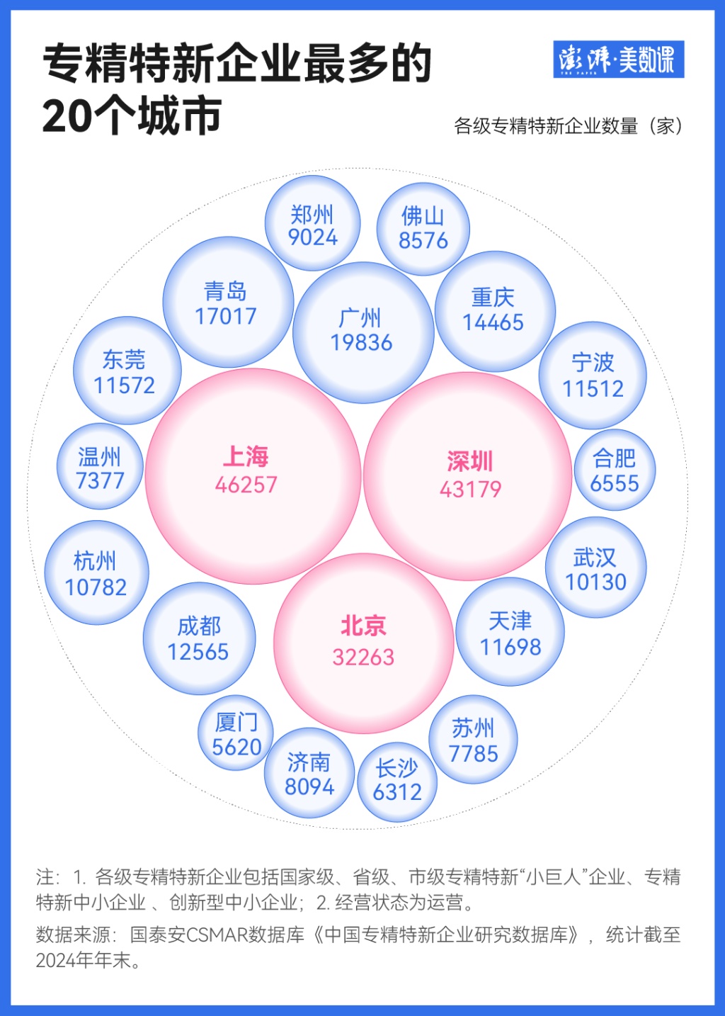 梳理《中国专精特新企业研究数据库》发现,注册地在上海的专精特新“小巨人”企业、专精特新中小企业或创新型中小企业达4.6万家,该数字超过了其他一线城市。