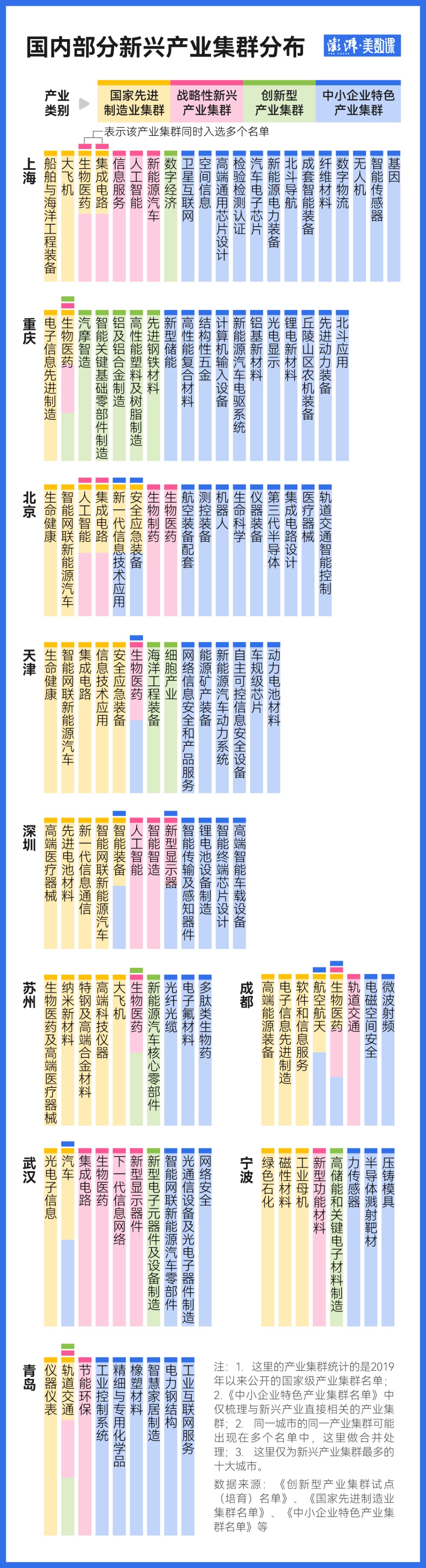 梳理发现,从2019年开始,国家发展改革委、科技部和工信部先后公布了500多个国家级产业集群,上海入选的产业集群数量超过20个,居于全国前列。