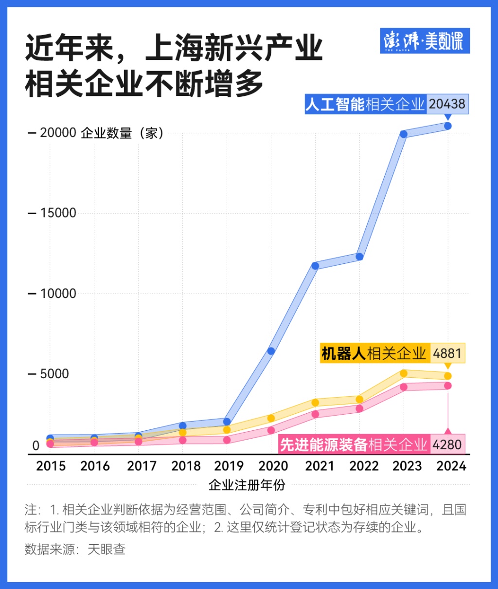 也正是有这样的产业政策,让聚焦人工智能这样新兴产业的企业在上海不断涌现。第三方平台记录的企业注册数据显示,2024年,上海新增人工智能相关企业超2万家。
