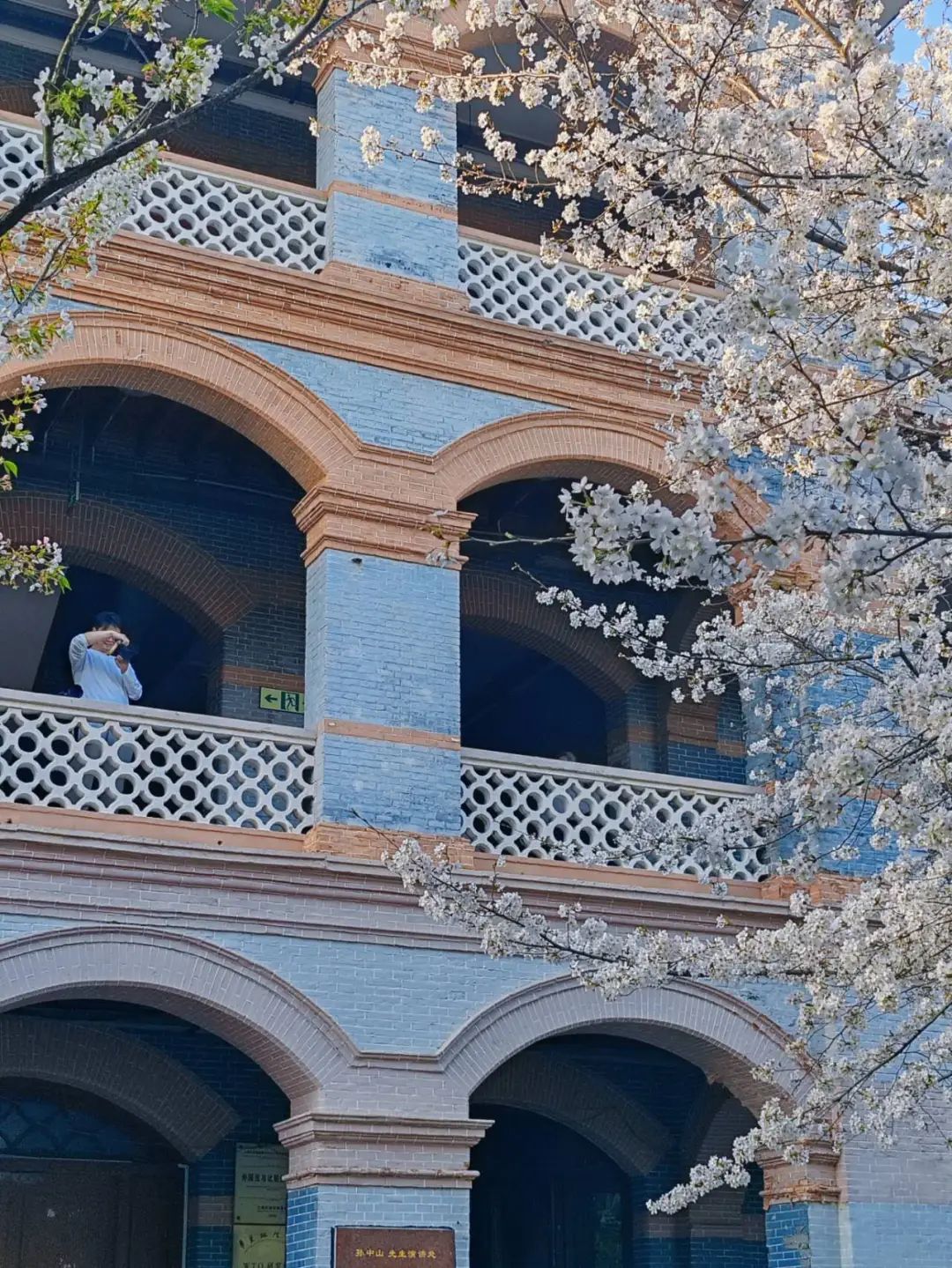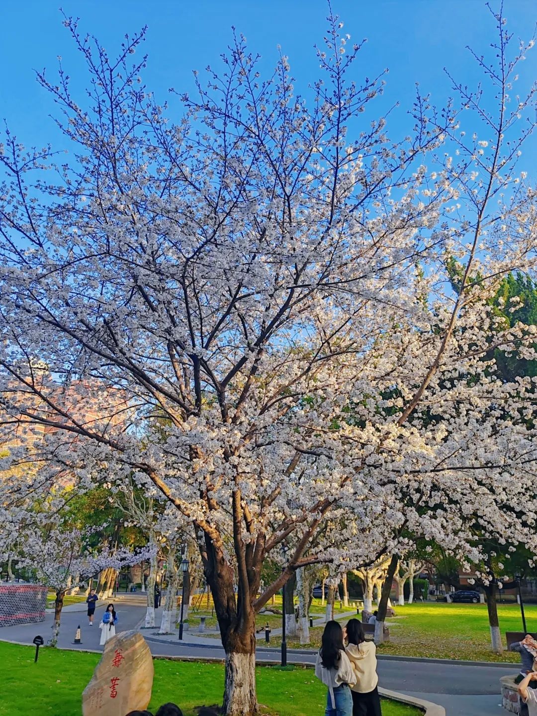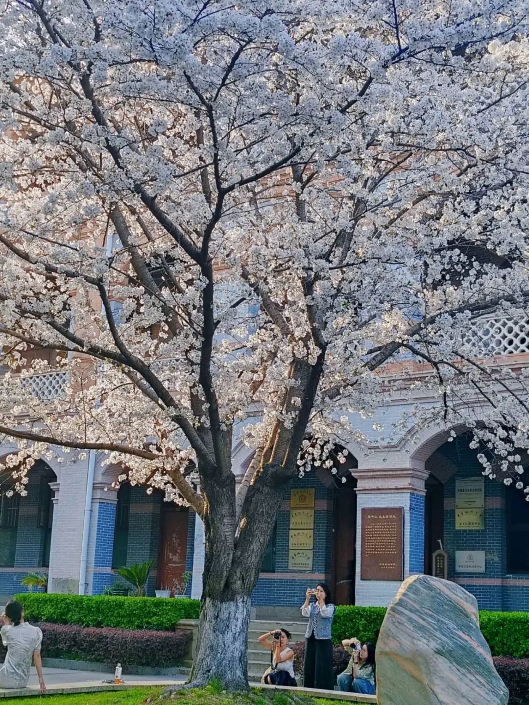 思颜堂前,一株樱花树开得静美。粉白的花瓣攒聚在枝头,远远望去,如一团轻云浮在檐角。学子和游客们排着队,在树下拍照。他们笑着,将手机举得高高的,屏幕里便盛满了花。