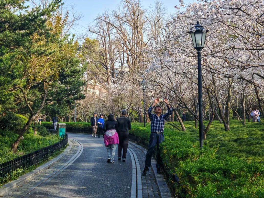 除了樱花亭,中山公园1号门附近的两株樱花同样“绊”住了市民游客的目光,饱满的花球引得众人纷纷驻足,欣赏这美丽的春日花卉。
