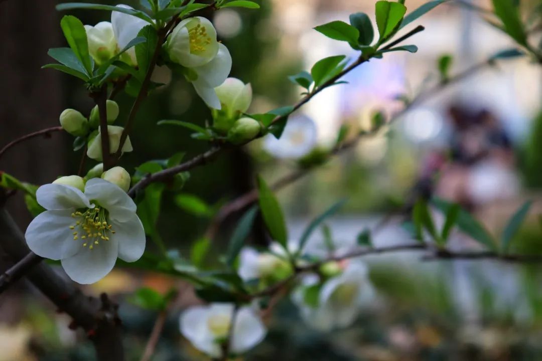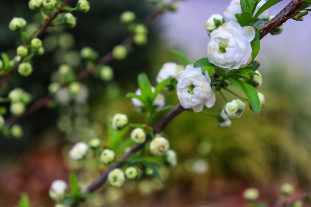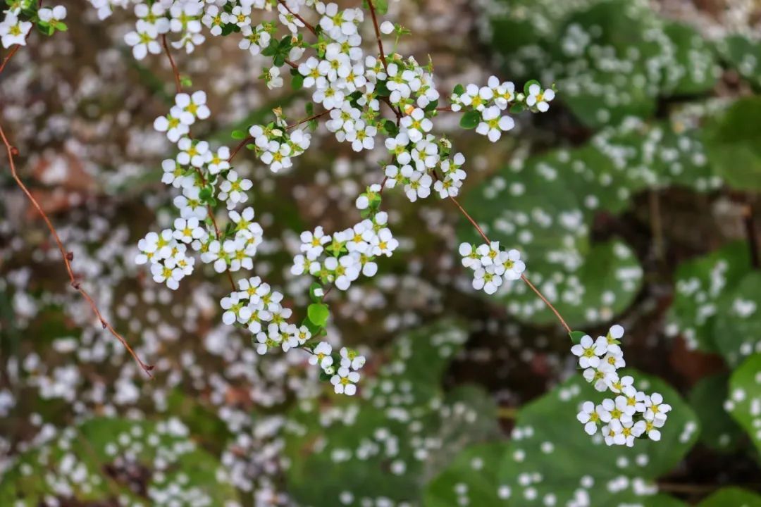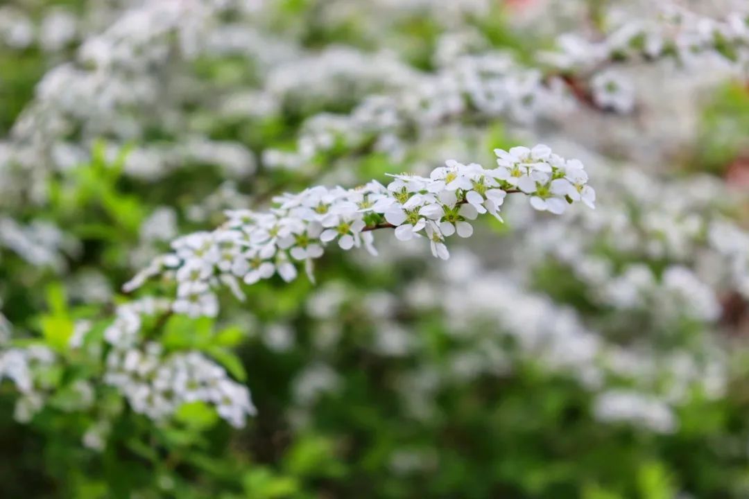 珍珠绣线菊远看似大雪压枝,近看似珍珠,因其开花时花朵密集,花白如雪,故而也被称作“喷雪花”。柔韧的长枝随风摇曳,白色的小花压满枝头,摆动间星星点点的花瓣落在地上,清丽雅致,仿佛春日雪景一般。