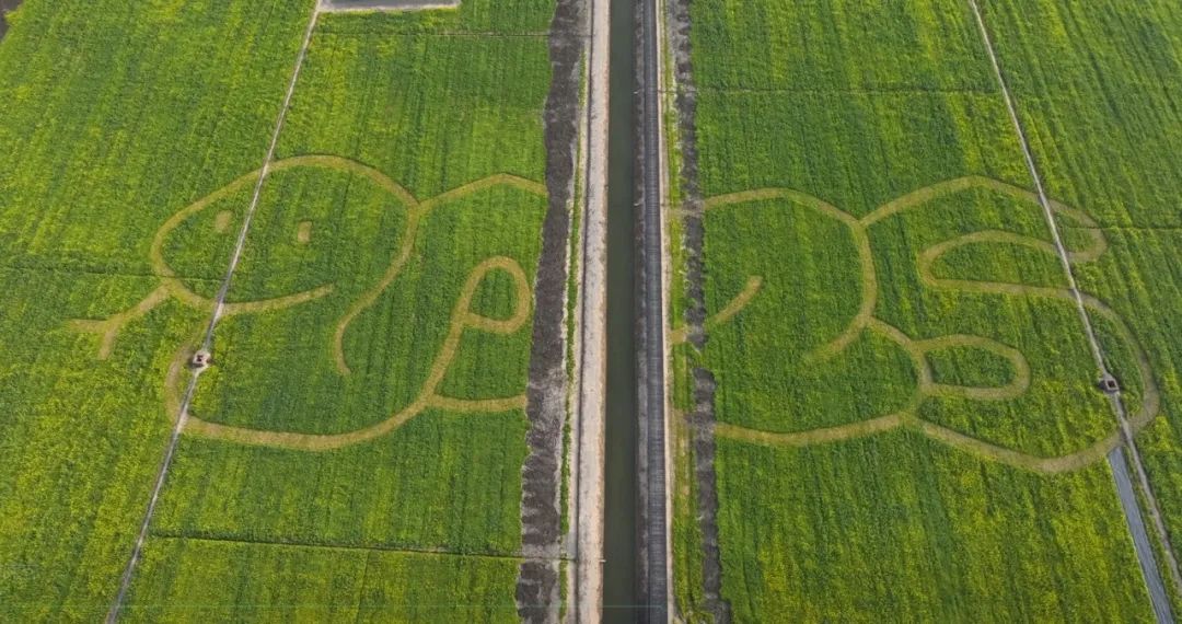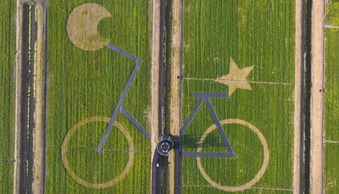 油菜花田按照南北两个区域分别做了图案设计。南部花田以农历癸卯蛇年为主题,灵动盘桓的卡通蛇造型跃然田间,将生肖祥瑞与田园诗韵完美融合。北侧则巧妙呼应横沙“生态骑行岛”的名片,采用自行车的图案,仿佛车轮滚过花海,踏“星”追“月”,驶向横沙的春天。