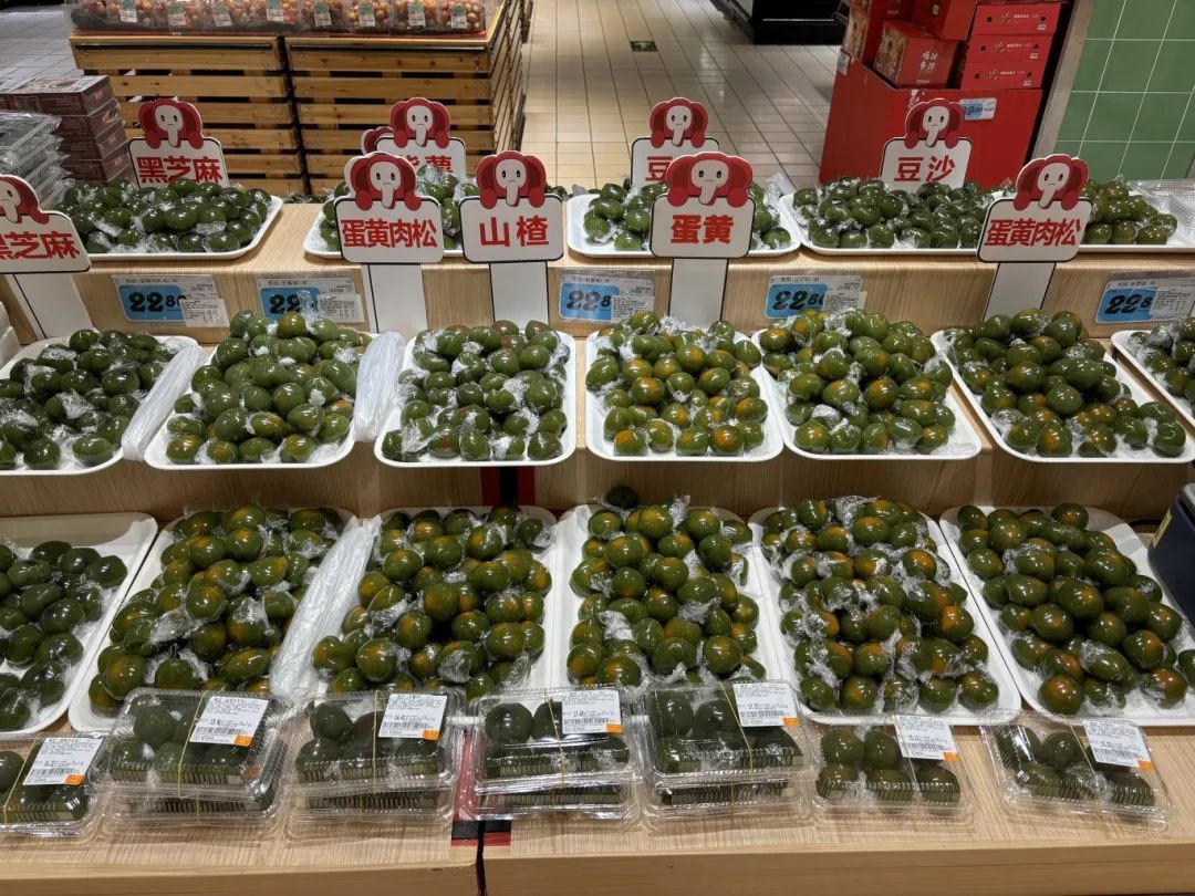 青团又叫“清明粿”或“青圆子”,其历史可以追溯到一千多年前,最早和寒食节有关,逐渐演变成清明节期间的传统食品,在江南地区尤为流行。发展至今,口味也变得十分丰富,记者看到,市面上的青团除了传统的豆沙、黑芝麻、蛋黄肉松口味,还有金桔、奶昔等创新口味,目前青团已经进入销售高峰。“今年我们准备了十几种口味,价位有几元一盒的,也有按斤称重售卖的20几元一斤,平均每天销量在两三百斤左右。”大润发松江店值班经理潘子鹤介绍。