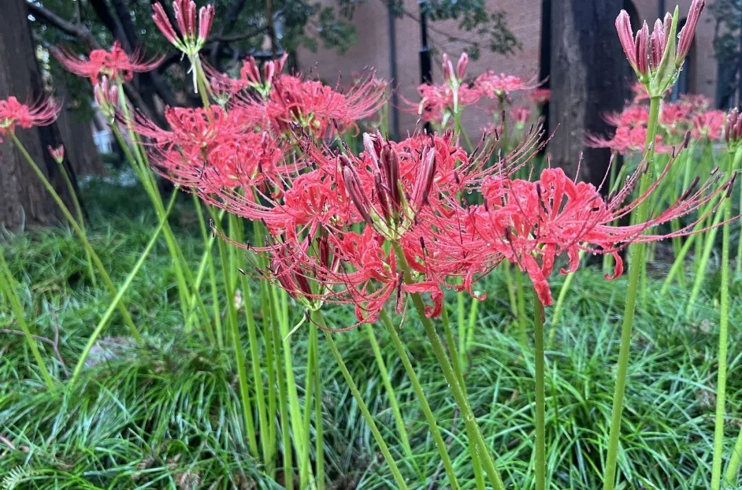 不过收到石蒜也别气馁。石蒜花开时,花茎从土壤中破土而出,一枝枝花茎抽离地面,在顶端盛开着4-8朵鲜花,像彩色的雨伞,又形似古时精美的宫灯。