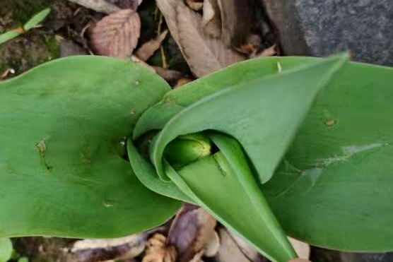 郁金香的叶片在刚发芽的时候是包裹起来的,呈现出一个绿色小尖角的形状,看不出来叶片展开成一片一片的形状,这个卷起来的小尖角至少长到3cm的高度才会逐渐展开成叶片。