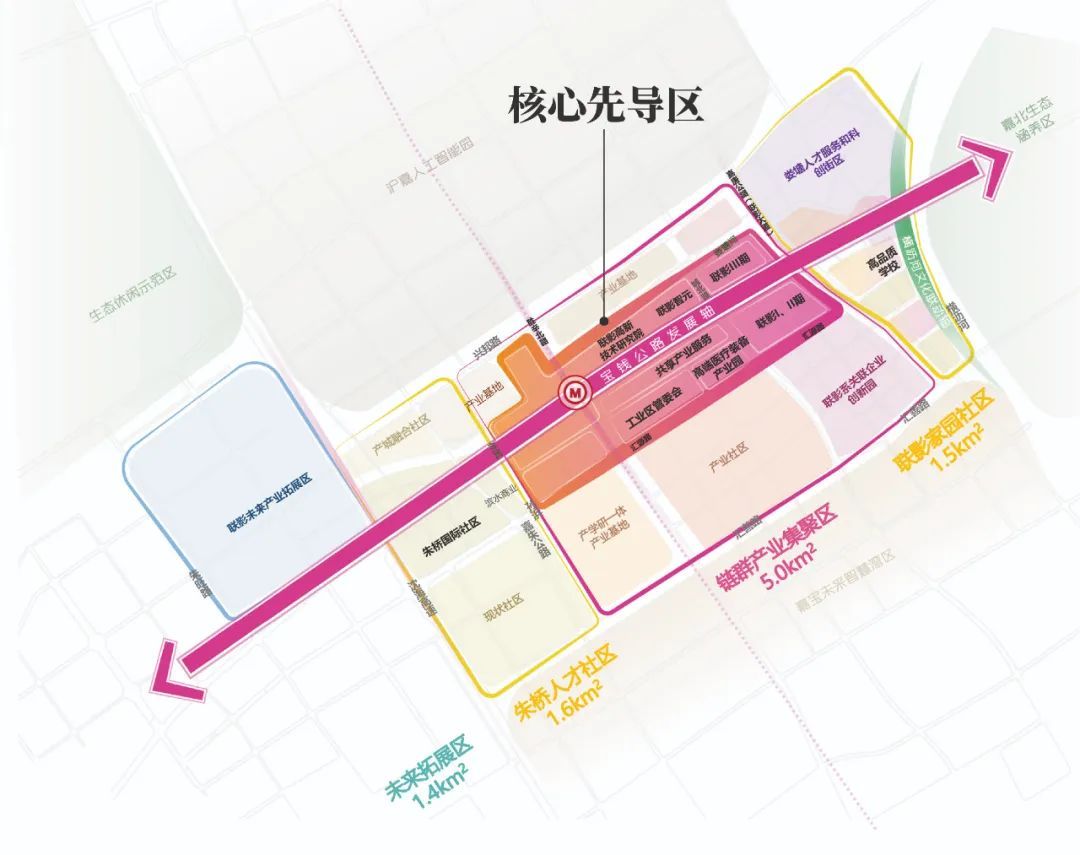 联影小镇整体形成“一核一轴四片”的空间结构,即围绕中央的核心先导区,由宝钱公路串联,自东向西形成联影家园社区、链群产业集聚区、朱桥人才社区和联影未来拓展区四个板块,通过“城、人、产”深度融合的发展新模式,把“产”的能级做得更强,把“城”的功能做得更优,打造便捷宜居的生活空间和“三生”融合的示范标杆。