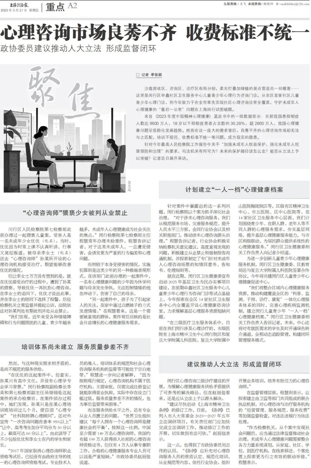 闵行区心理咨询三级诊疗建设的开展,为缓解心理健康服务供给矛盾提供了可参考的解决路径。但在赵丽佳看来,还是应从立法上予以源头解决。