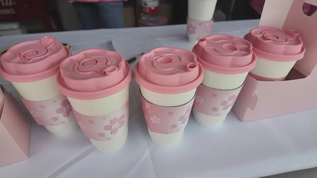 为了让市民有更丰富的赏花体验,现场还专门打造了精美的樱花布景。深粉色调的主题艺术装置与多辆经过改造的花车相得益彰,成为市民游客拍照打卡的热门地点。其中一辆花车被巧妙地打造成巴士餐车的模样,提供樱花系列的咖啡、气泡水。无论是外观的樱花装饰,还是饮品独特的口感,都给人带来视觉与味觉的双重享受。还有一辆花车被打造成充满公交文化气息的文创集市,印有公交元素的樱花杯、精致的公交车模型、可爱的樱花造型徽章、贴纸、抱枕等文创产品琳琅满目,让人心动不已。