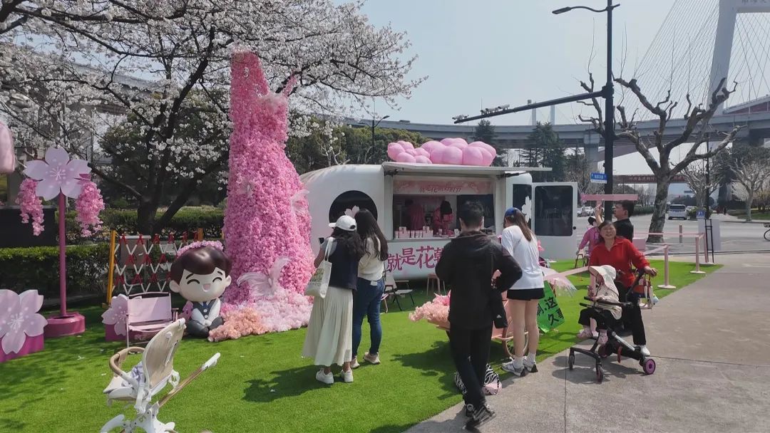 不少市民在现场流连忘返,直呼“到处都是樱花的元素,眼睛有些忙不过来了”。“这些文创都很漂亮,拍照片也很好看。”市民王阿姨开心地说道。刚从地铁站出来的市民,也被眼前的美景所吸引:“我刚从地铁站出来就看到了这个花车,粉粉嫩嫩的,和樱花美景非常搭。”