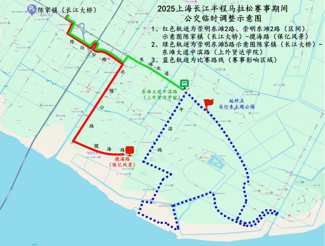 2025上海长江半程马拉松赛将于2025年3月30日在崇明区举行。小编从崇明巴士公司了解到,为确保本次赛事安全、顺利进行,根据上海市公安局崇明分局对赛事涉及道路实行的交通管制措施,将对受影响的公交线路进行临时调整。请市民乘客相互转告,合理安排出行! 一、比赛路段 起点(自行车主题公园)-东滩大道(逆行)-中滨路(逆行)-揽海路-北郊路-环岛大堤-护鲟路-瀛东南路(折返)-揽海路-崇园路-东滩大道(逆行)-终点(自行车主题公园)。 2025上海长江半程马拉松赛道路线图 二、赛事前期交通管制措施 (一)交通管制时间 2025年3月29日14时至3月30日14时 (二)交通管制范围 东滩大道(中滨路至层海路)南侧道路,禁止一切车辆通行。 三、赛事当日交通管制措施 (一)交通管制时间 2025年3月30日7时30分至11时 (二)交通管制范围 东滩大道(崇园路至中滨路)南侧道路、中滨路(东滩大道至揽海路)东侧道路、揽海路(中滨路至北郊路、瀛东南路至团旺河桥东无名路口)、北郊路(揽海路至瀛东南路)、环岛大堤(北郊路至护鲟路)、护鲟路(环岛大堤至瀛东南路)、瀛东南路(护鲟路至揽海路)、崇园路(揽海路至东滩大道),禁止一切车辆通行。 四、影响线路 崇明东滩2路、崇明东滩2路(区间)、崇明东滩5路。 五、线路调整安排 (一)崇明东滩5路 1.缩线营运时间 2025年3月29日14时至3月30日14时 2.走向 自陈家镇(长江大桥)起经陈海公路、锦陈公路、陈彷公路、北陈公路、东滩大道至东滩大道中滨路(上外贤达学院)(双向)。 3.关闭站点 层海路环瀛路 (二)崇明东滩2路、崇明东滩2路(区间) 1.缩线营运时间 2025年3月30日7时30分至11时 2.走向 全程及区间走向均自陈家镇(长江大桥)起经陈海公路、锦陈公路、陈彷公路、北陈公路、揽海路至揽海路(保亿风景)(双向)。 3.关闭站点 • 区间站点:中滨路揽海路、露港桥、迎海路、营房、瀛陈路瀛东村路、瀛东村双向共计12个站点。 • 全程站点:揽海路(揽海国际)、揽海路(海上明月)、团结沙双向共计5个站点。 涉及公交线路调整示意图 六、注意事项 1.交通管制时间以现场民警指挥为准,交通管制撤消后上述线路立即恢复原线运营。 2.受现场交通管制影响,车辆实际到站时间可能会与计划到站时间出现差异,请市民乘客谅解。 资料:崇明巴士 编辑:焦倩倩