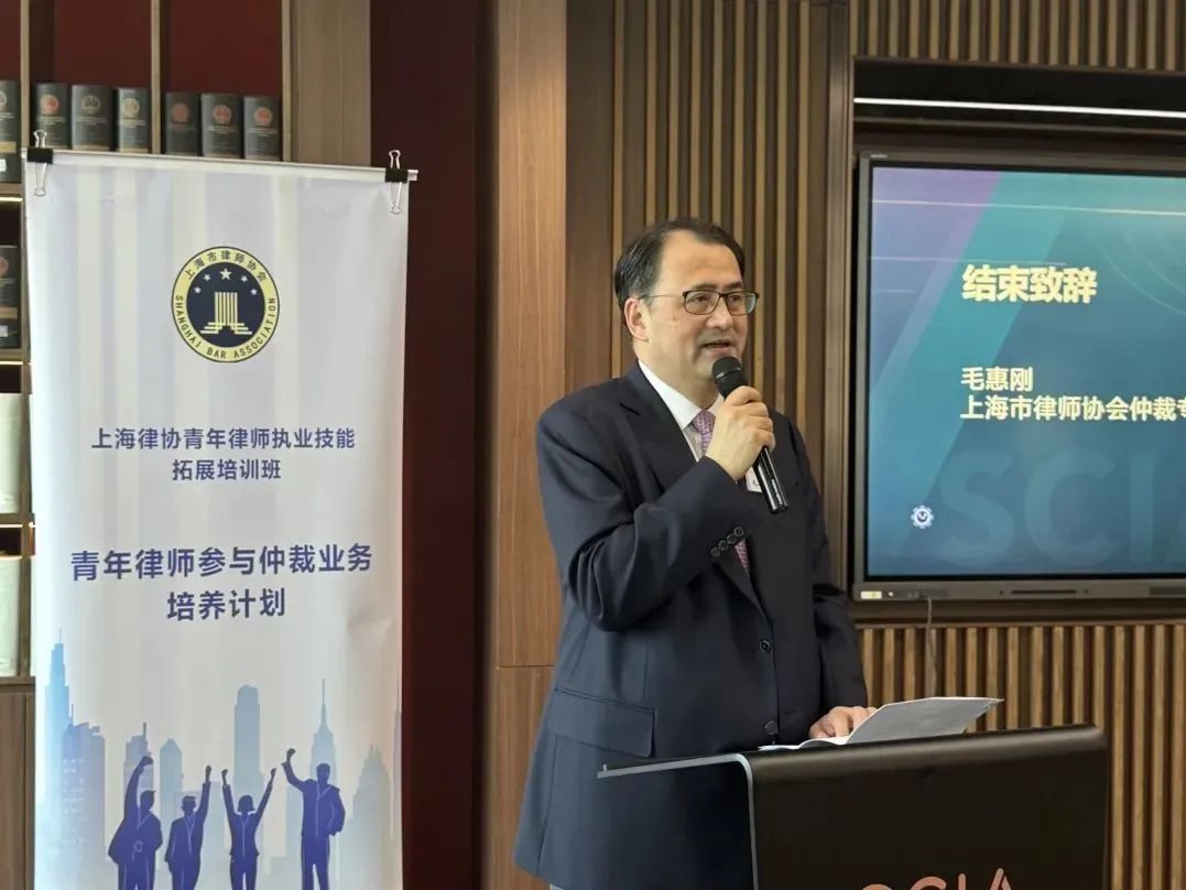 培训尾声,上海律协仲裁专业委员会主任毛惠刚为本期培训作结束致辞。毛惠刚主任就律师、特别是青年律师在仲裁中可以发挥的作用及承担的角色做了经验分享,同时鼓励广大青年律师在仲裁领域不断开拓、再上新台阶。