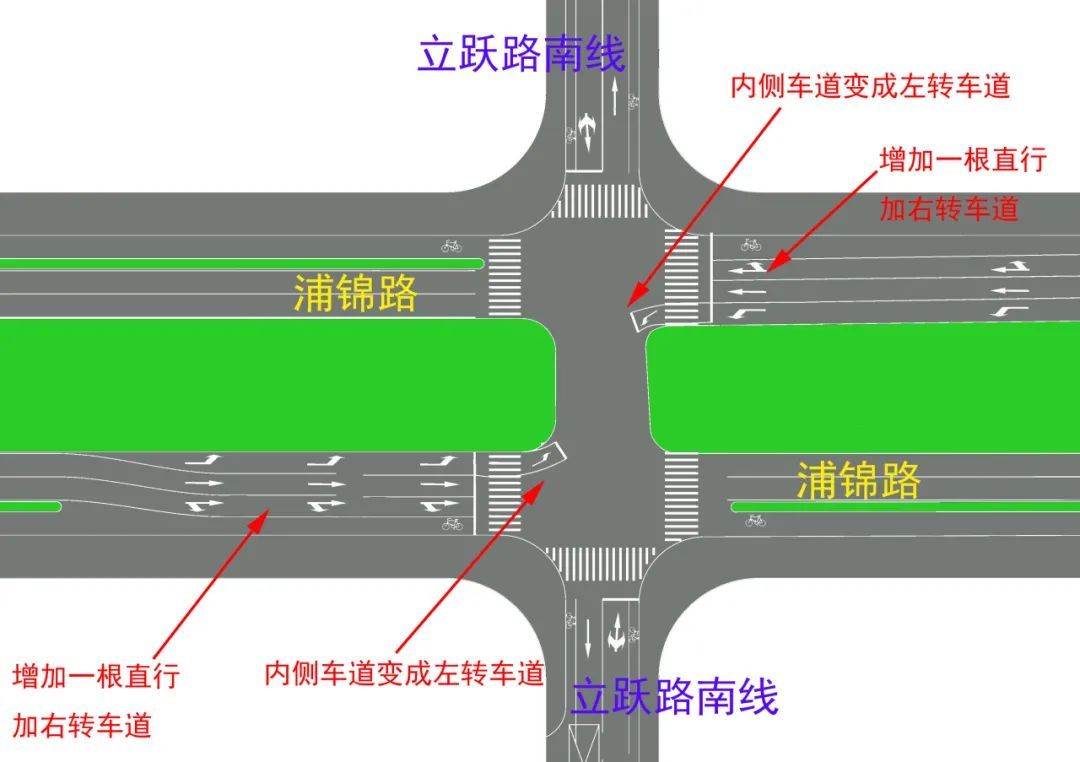 本次渠化长度约120米,浦锦路立跃路路口两侧机非隔离的绿化带位置改为车行道,入口处最左侧为左转道,中间为直行车道,右侧为直行加右转车道。图示如下:
