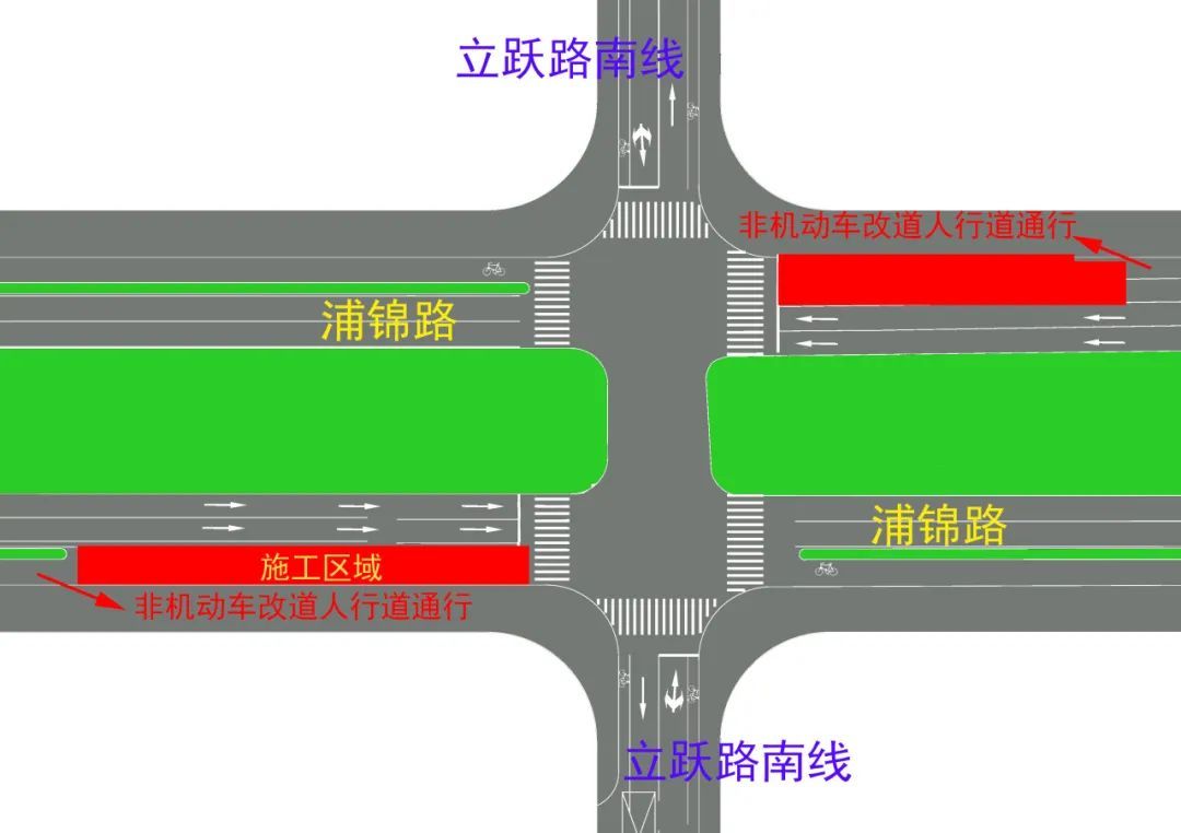 施工期间,浦锦路两侧非机动车道改道人行道通行,请认准蓝色指示牌,机动车行车路线不受影响。图示如下: