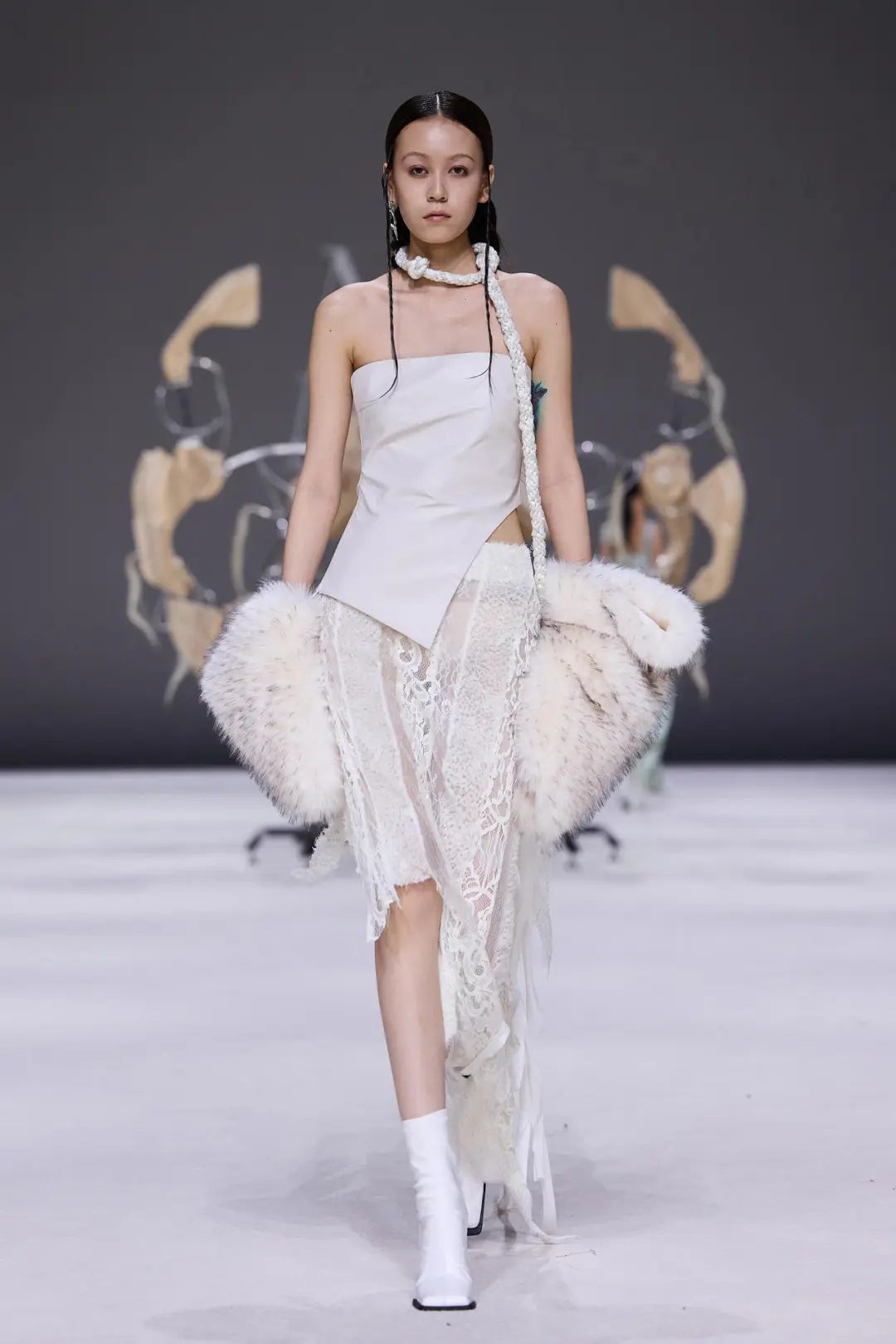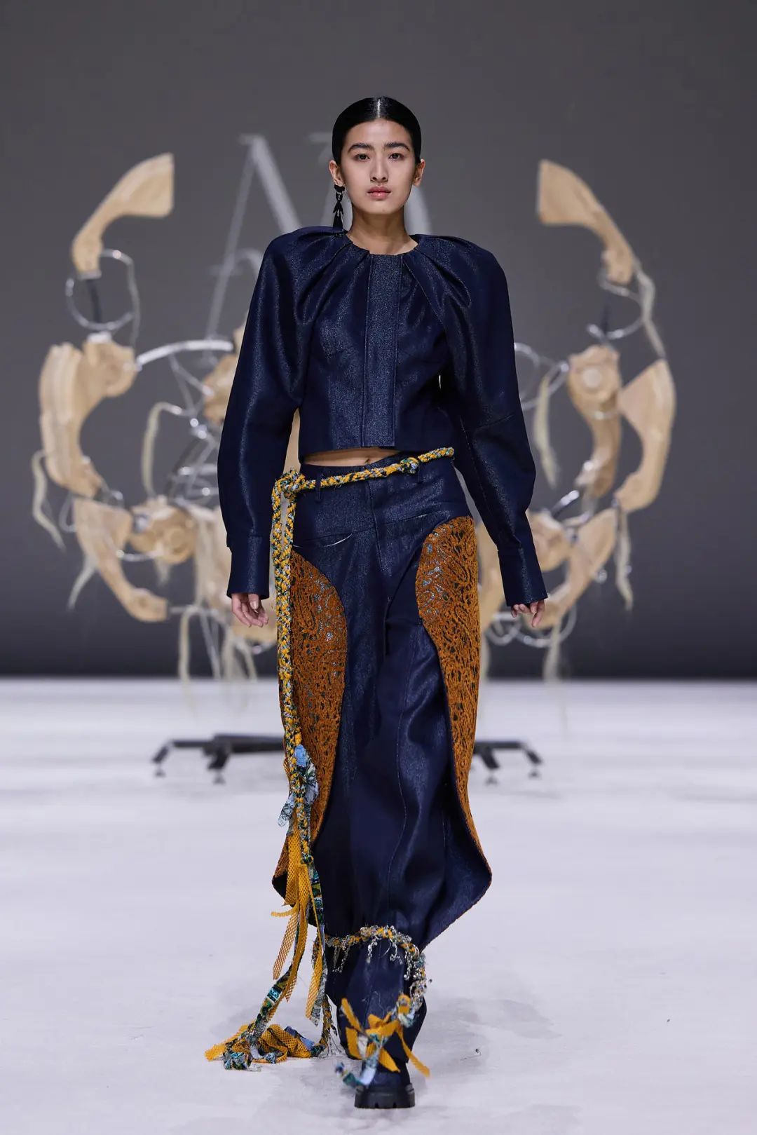 现场,设计师Christine将极简廓形与传统编织进行戏剧化对撞,百衲布肌理与功能性剪裁形成时空折叠的视觉诗篇。