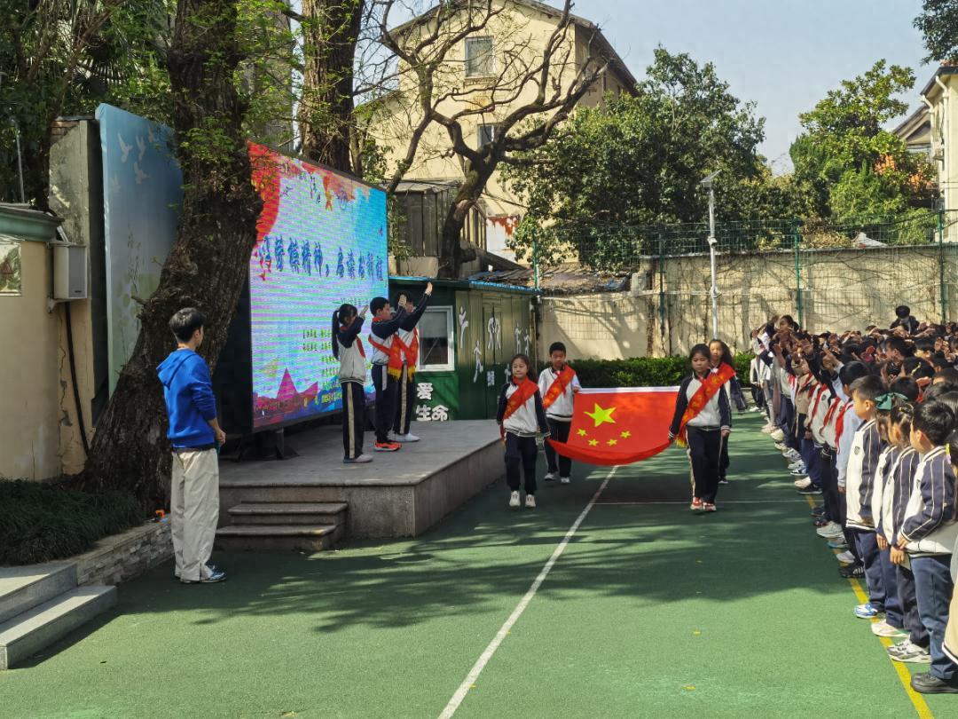 伴随《出旗曲》铿锵的旋律,世界小学4名小小护旗手昂首挺胸,将五星红旗护送至升旗台。在朝阳映照下,全体师生肃立高唱国歌,目送国旗升至顶端。