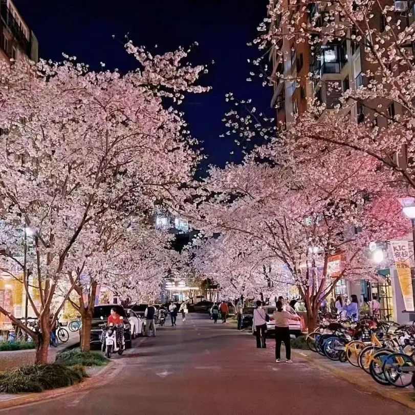 到了夜晚,路灯下的“夜樱”梦幻又迷人。万千重叠的影瓣在夜风中舒展,将伟德路渲染成梦幻的粉紫色。坐在月下赏樱,空气中都有暗香浮动,让人有种“花前月下”的别样氛围感。