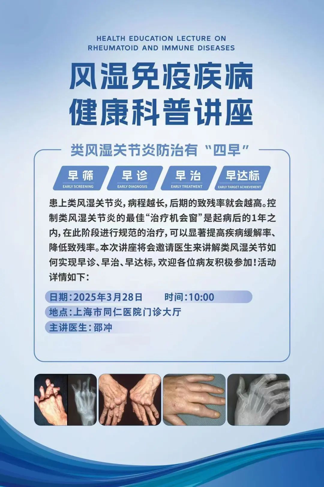 本次讲座将会邀请医生来讲解类风湿关节如何实现早诊、早治、早达标,欢迎相关病友和家属过来聆听、沟通交流。