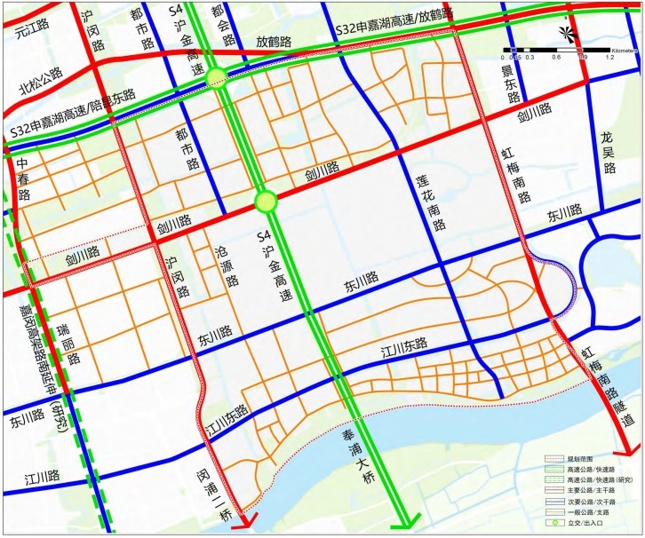 其中“四横”包括S32申嘉湖高速/放鹤路、剑川路、东川路、江川东路,“四纵”包括S4沪金高速、沪闵路、虹梅南路、莲花南路。规划全路网密度达8.0km/k㎡以上。