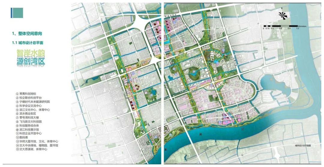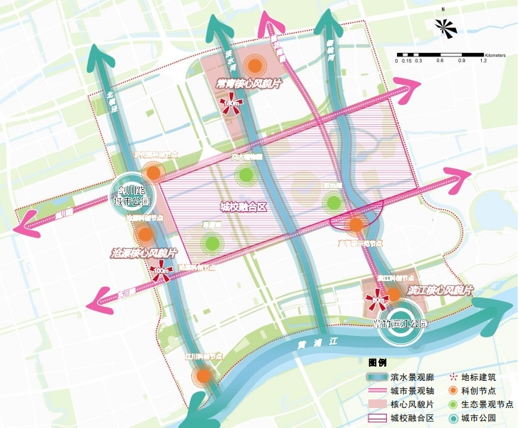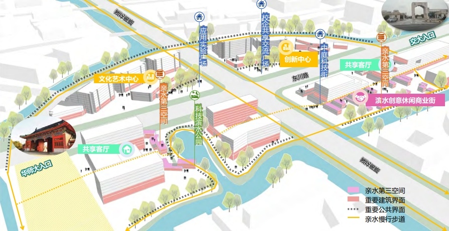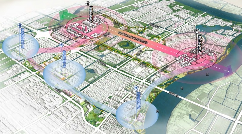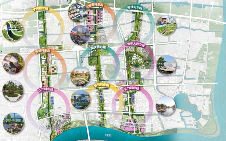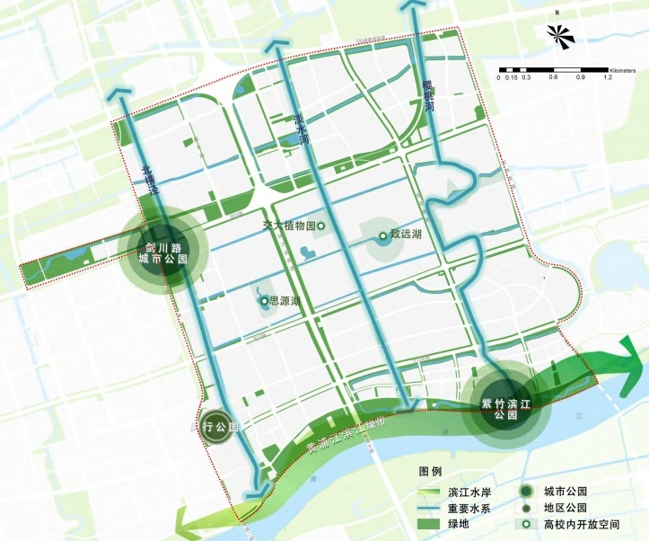 围绕南北向三条历史水系和滨江绿带,构建区域蓝绿骨架。整合地区、校园内外开放空间和公共设施资源,重塑滨水空间的开放性。沿水岸进一步集聚科创和休闲功能,塑造活力科创岸线,结合滨水空间精细化设计,加快沿线存量产业空间转型更新,结合各分段水岸的资源禀赋,营造多元复合、各具特质的滨水空间。