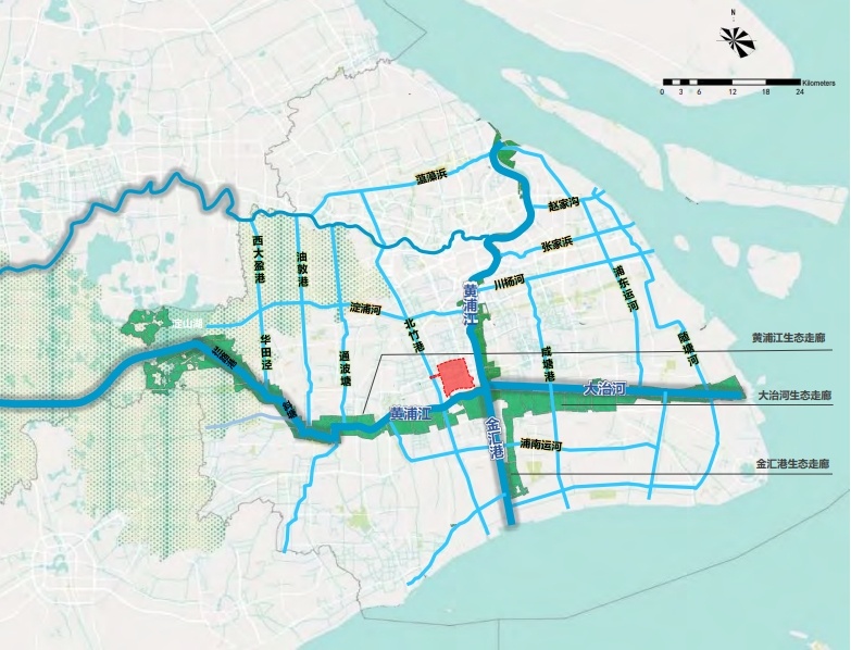 “四廊”指结合北横泾、淡水河、樱桃河和黄浦江,联动两侧腹地与公园绿地,打造