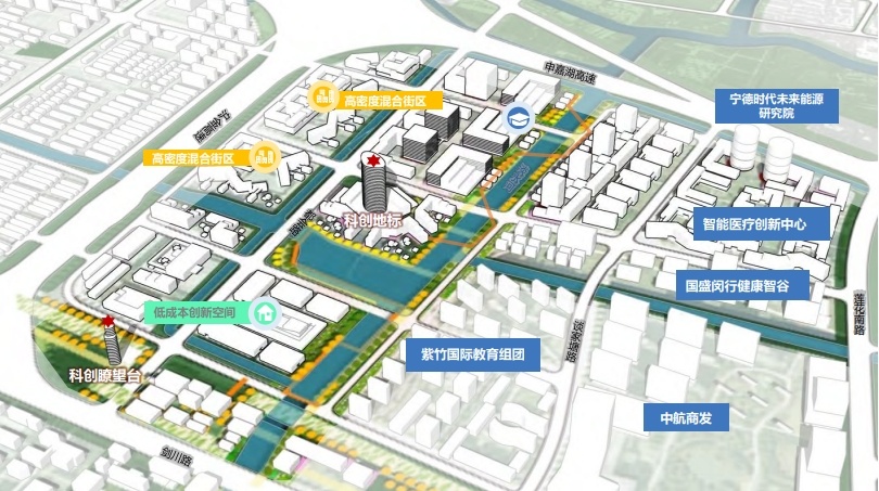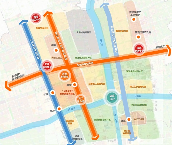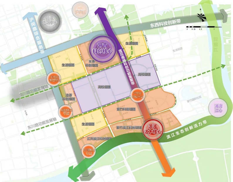 规划形成常青科创核心、滨江活力核心两个核心节点以及江川、沧源等多个科创节点。其中,常青科创核心打造成高校周边最具创新浓度的科创地标,集聚孵化器、研发机构等。滨江活力核心打造为滨江科创交流中心,布局科学会议中心、体育中心等功能。