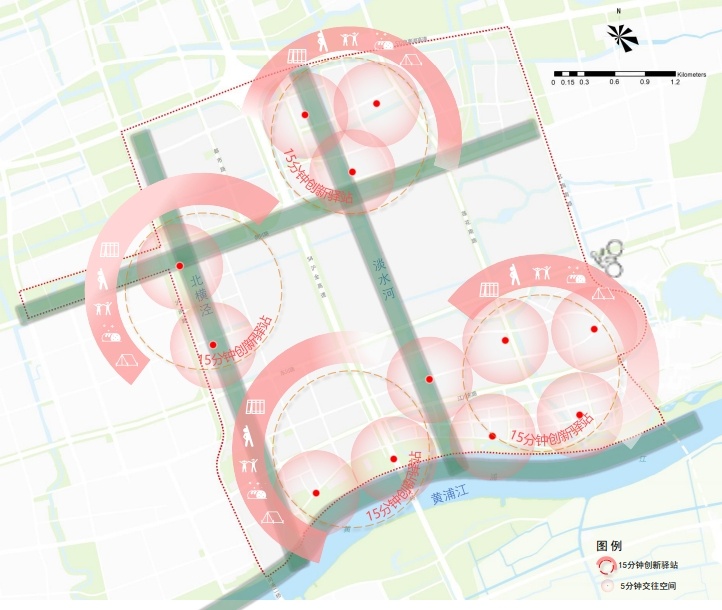 为科创人才提供高密度的交流交往空间,在科创功能区内构建四个“15分钟创新驿站”和X个“5分钟交往空间”。