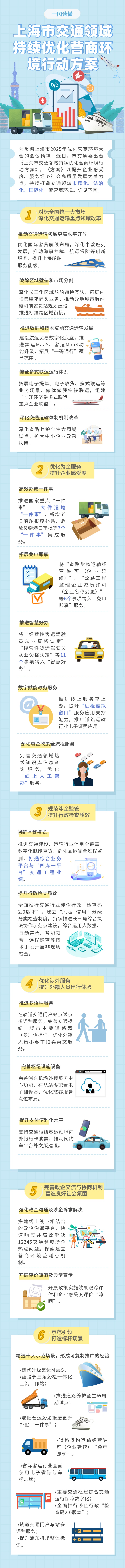 近日,市交通委以提升企业感受度、服务经济社会高质量发展为着力点,出台《上海市交通领域持续优化营商环境行动方案》,方案从对标推进统一大市场建设改革、提升企业感受度、提高行政检查质效、提升外籍人员出行体验、完善政企协商机制等五个方面着手,包含5大类30大项任务67项具体工作措施,着重推进十个示范场景建设,推动交通领域营商环境的持续改善,同时为交通领域营商环境优化积累更多可复制可推广的经验,来看解读!