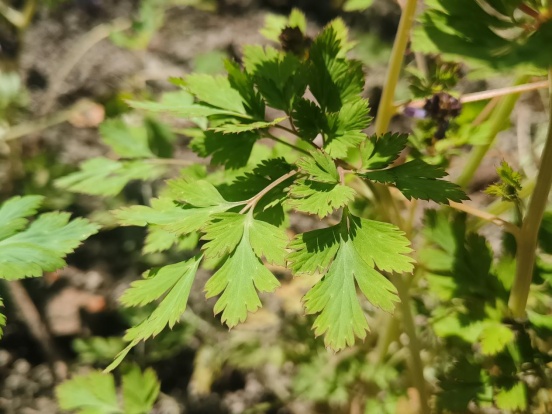 刻叶紫堇,如同其名,叶片有着细细的锯齿,宛如被精心雕刻一般,有着犹如蕨类植物的细腻与洒脱,还带着灰绿或橘红的奇异色彩,观叶价值十分突出,也因此有人将它作为观赏植物种植,花开季节更是惊为天人,精巧的“小烟斗”上,一抹蓝紫如唇印涂抹在花瓣上,若连成一片浓郁蓝紫,则更如梦似幻。