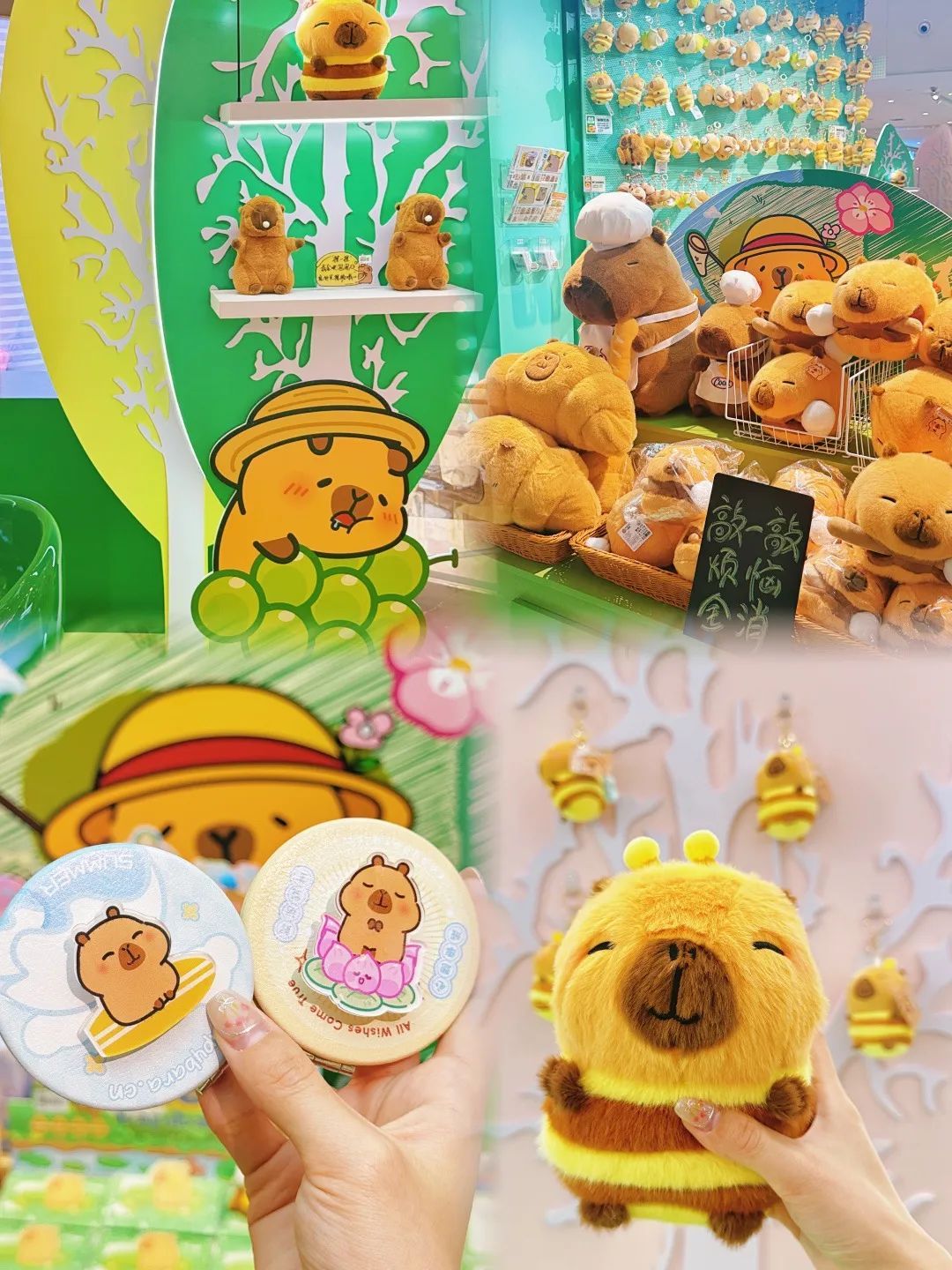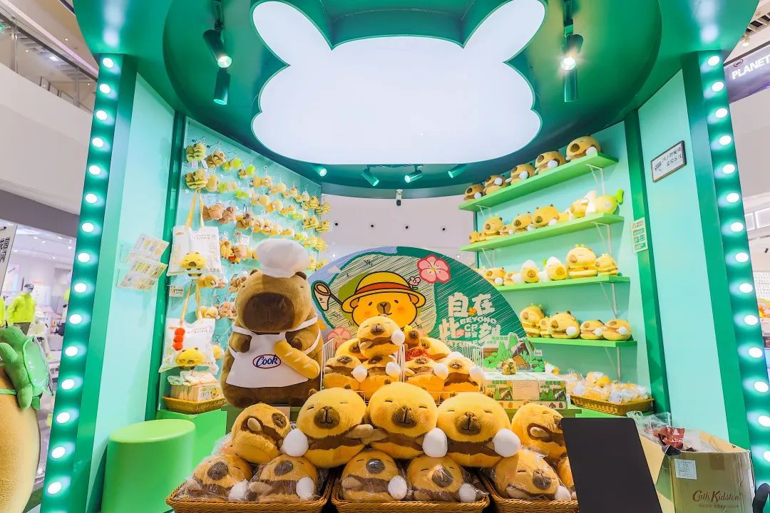 花园小径通向一家只卖“卡皮巴拉”周边产品的“疗愈屋”,多款毛绒绒豚感周边限定发售,打造专属“豚门人”的快乐星球。蜜蜂豚崽、拒绝焦虑豚、烘焙系列……花样繁多、创意十足的卡皮巴拉公仔,吸引市民驻足选购。