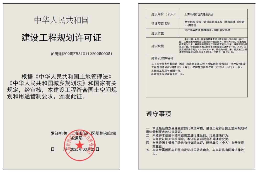记者从区规划资源局获悉,近日,闵行区“申长北路—金园一路道路贯通工程(博恒路北—爱特路)”建设工程规划许可证获批,标志着该项目即将进入建设阶段。