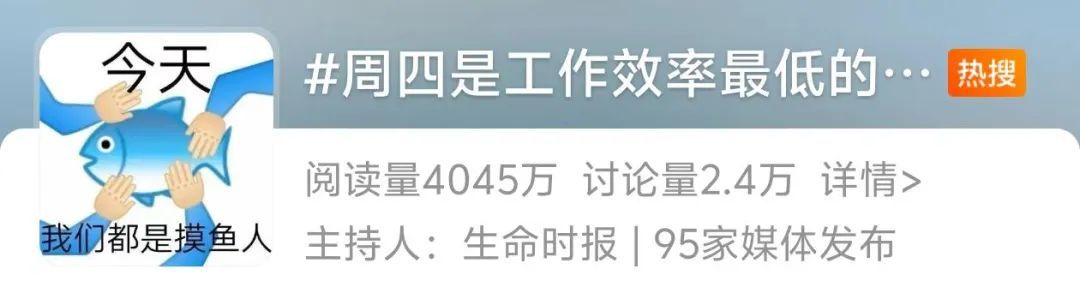 昨天,话题#周四是工作效率最低的一天#冲上热搜!阅读量超4000万,讨论量达2.4万!因为有研究数据显示,29%的人认为周一产出最高,而周四成为效率曲线的低谷。
