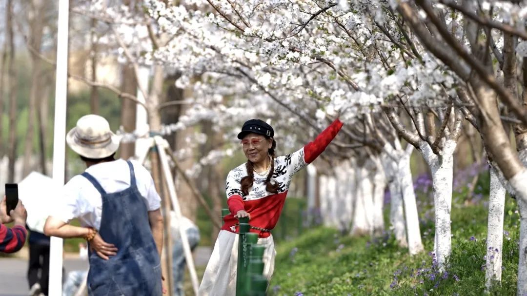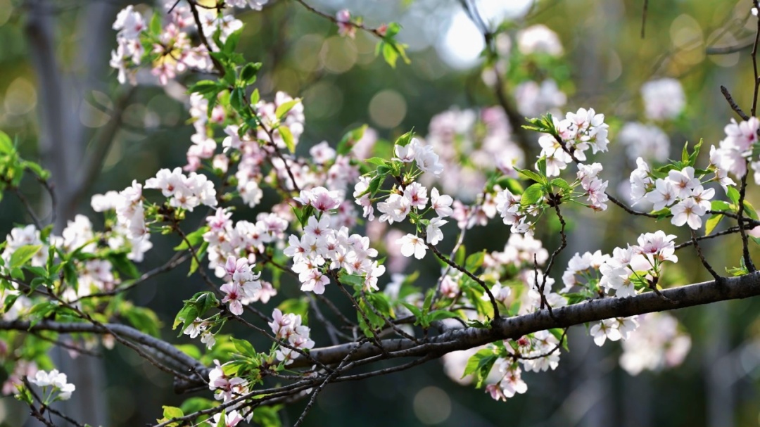远远望去,公园上空如有云霞悬挂;走近细观,枝头樱花簇簇相拥,花瓣薄如蝉翼,花色以浅粉为主,花蕊纤细金黄,点缀其间,更添灵动……微风拂过,花瓣簌簌飘落,仿佛一场不期而遇的“春雪”,引得市民游客伸手轻接。