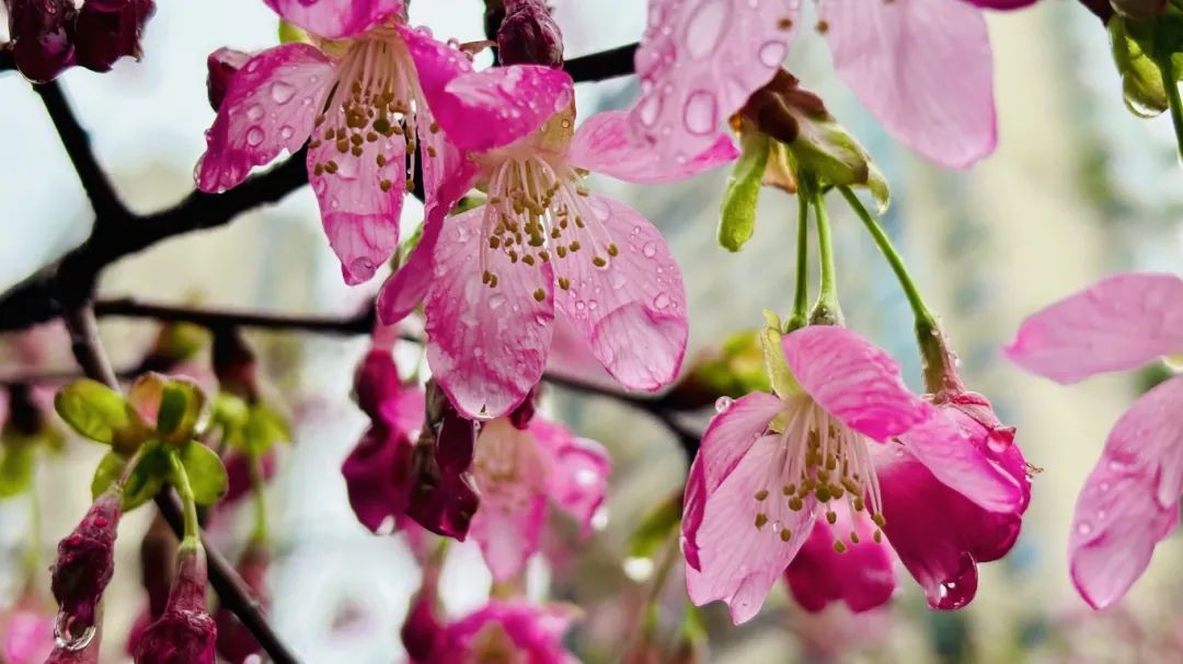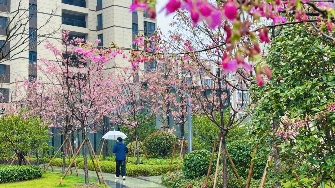 雨丝轻拂,钟花樱在伞下悄然绽放,花瓣如粉色的梦,随风轻舞。脚下的石板路被雨水浸润,映出淡淡的花影,每一步都仿佛踏在春的诗行里。