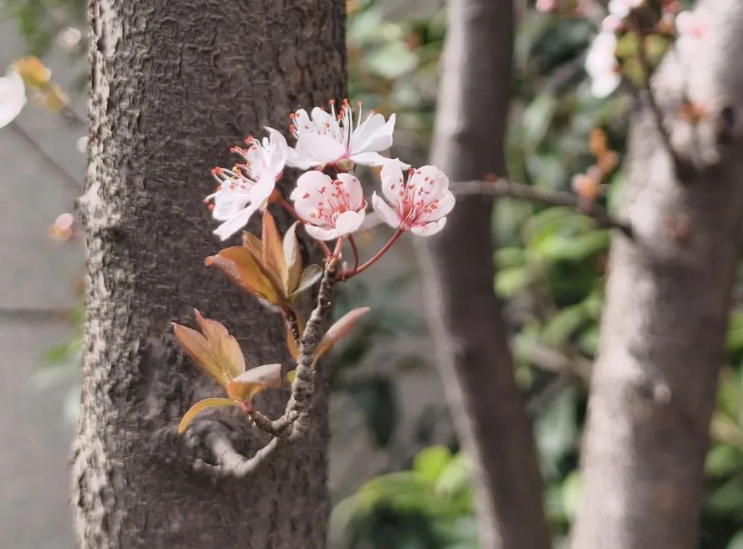 紫叶李的限定浪漫!粉白花瓣、绛紫叶片在阳光下温柔地绽放,走在这条繁花盛开的大道上不经意间便与这醉人的春光。