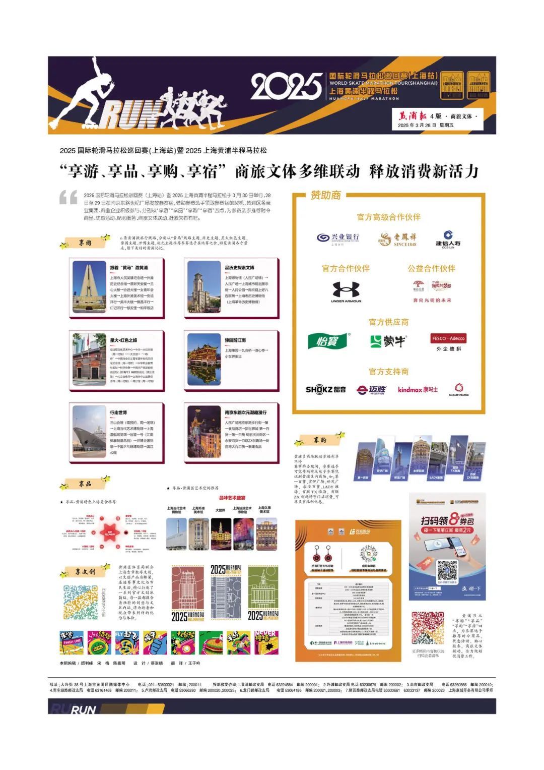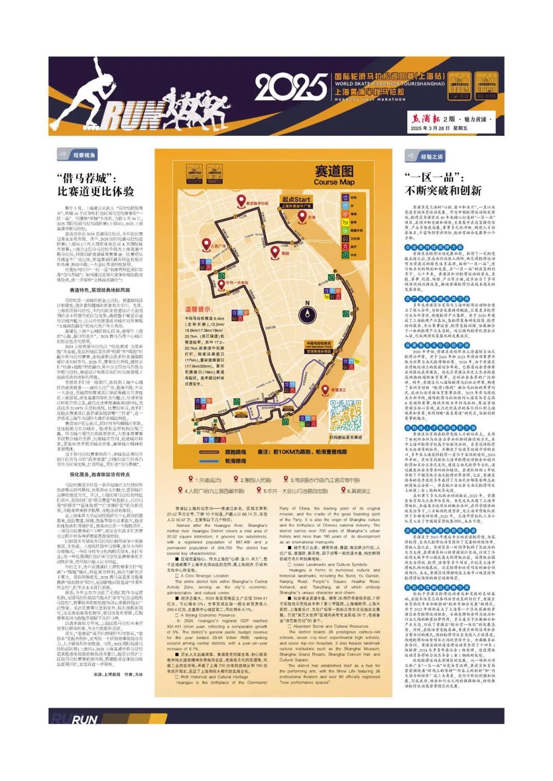 为体现对专业赛事的重视与服务广大参赛选手的意识,黄浦报特此推出《黄马特刊》,涵盖了观察视角、经验之谈、路线图、跑者故事、“享游、享品、享购、享宿”商旅文体多维联动等内容。值得一提的是,本次特刊用了四个版面的篇幅,精心刊登了全部选手与志愿者的名单,让每一个参与其中的人都能深切感受到黄浦的温度与魅力。