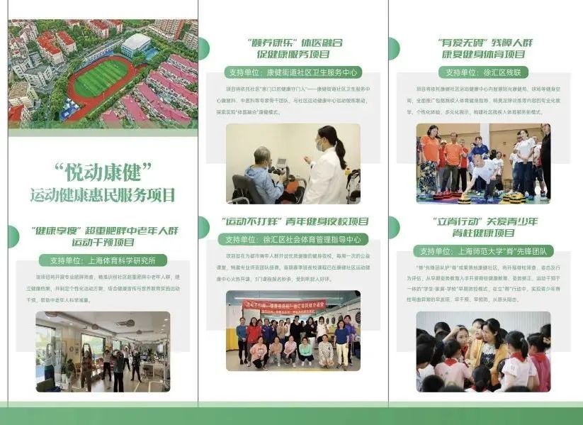 “有爱无碍”残障人群康复健身体育项目:携手徐汇区残疾人联合会,开展依托智慧阳光康健苑和丰富多样的球场和运动设施,构建社区残疾人体育服务新模式。