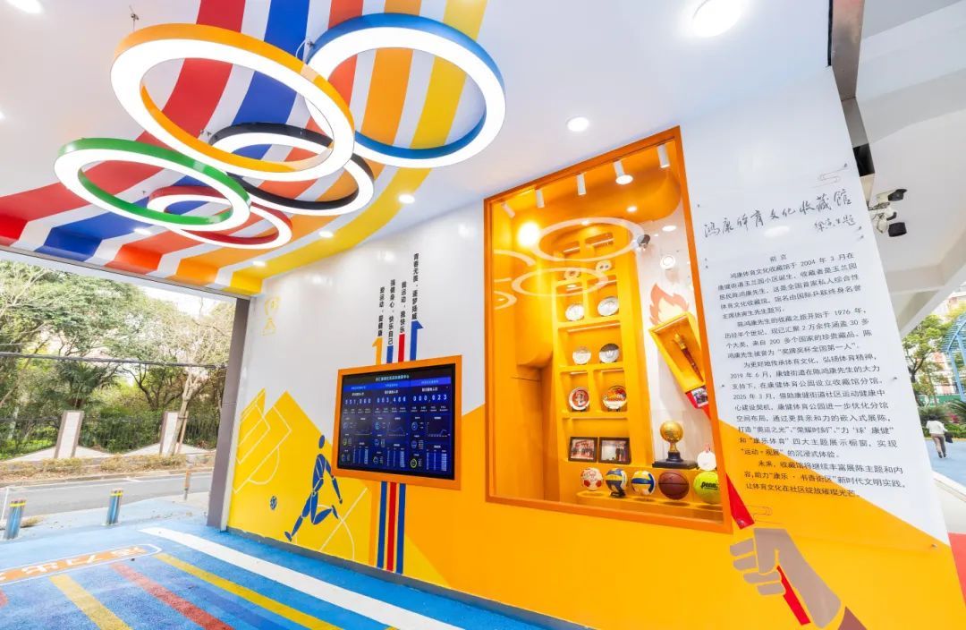 同时,鸿康体育文化收藏馆新展揭幕亮相。数百件体育收藏珍品+沉浸式观展,分分钟穿越奥运百年史。被誉为“奖牌奖杯全国第一人”的陈鸿康老先生已到耄耋之年,来自康健玉兰园居民区,是体育文化的守望者,历经半个世纪,收藏了2万余件来自200多个国家的珍品,涵盖30余大类。从2004年家中辟出14平方米小房间,建成国内首家私人综合性收藏馆“鸿康体育文化收藏馆”,到2019年康健体育公园设立收藏馆分馆,再到借助此次社区运动健康中心建设契机,筹建更具亲和力的嵌入式展陈,精心打造“奥运之光”“荣耀时刻”“力‘球’康健”“康乐体育”四大主题橱窗,实现“运动+观展”的沉浸式体验。