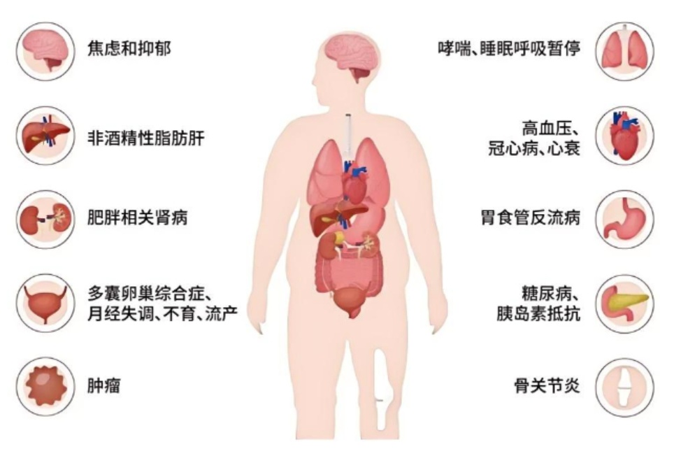 1. 糖尿病:肥胖程度越高,发生糖尿病前期和2型糖尿病的风险越大。很多患者也正是因为被诊断为糖尿病才开始正视自己的体重问题。对于超重或肥胖症患者,通过积极减重可有效预防糖尿病的发生、发展。