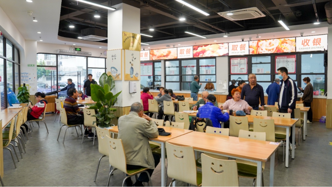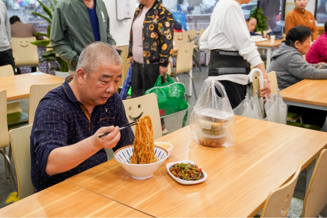 走进食堂,便能感受到浓浓的邻里情谊。前来用餐的大多是小区居民,大家一进门就热情打招呼,关系好的还会拼桌,边吃边聊,氛围轻松又温馨,如同在家中一般自在。食堂还充满人文关怀,60岁以上居民生日当天前来就餐,会送上一碗荷包蛋汤面。