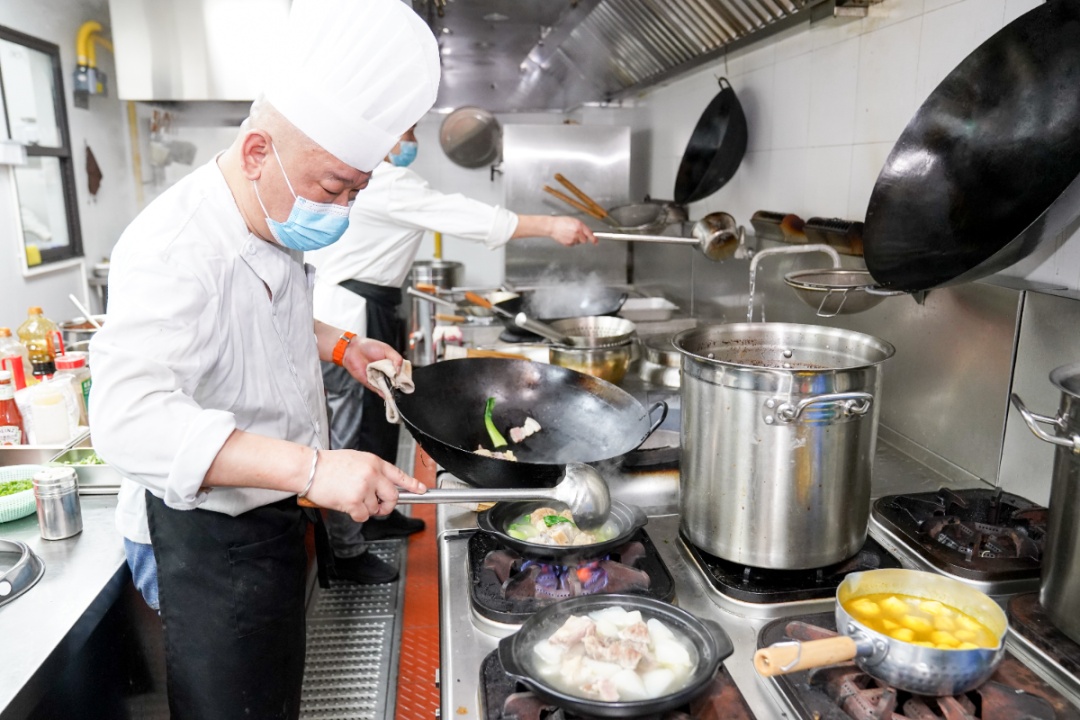 食堂里,砂锅也是一大特色。每日供应本帮三鲜砂锅、咖喱牛肉粉丝砂锅、小排萝卜砂锅等,满足不同居民的口味需求。后厨一大早便开始炖煮排骨、蹄髈等肉类,熬制高汤,鲜香口味吸引居民尝鲜。厨师长董一说:“本地三鲜砂锅主要用猪脚、小排、自制肉丸子和咸肉,搭配蔬菜,荤素搭配,再放点百叶结,这就是上海人说的家常味道。”