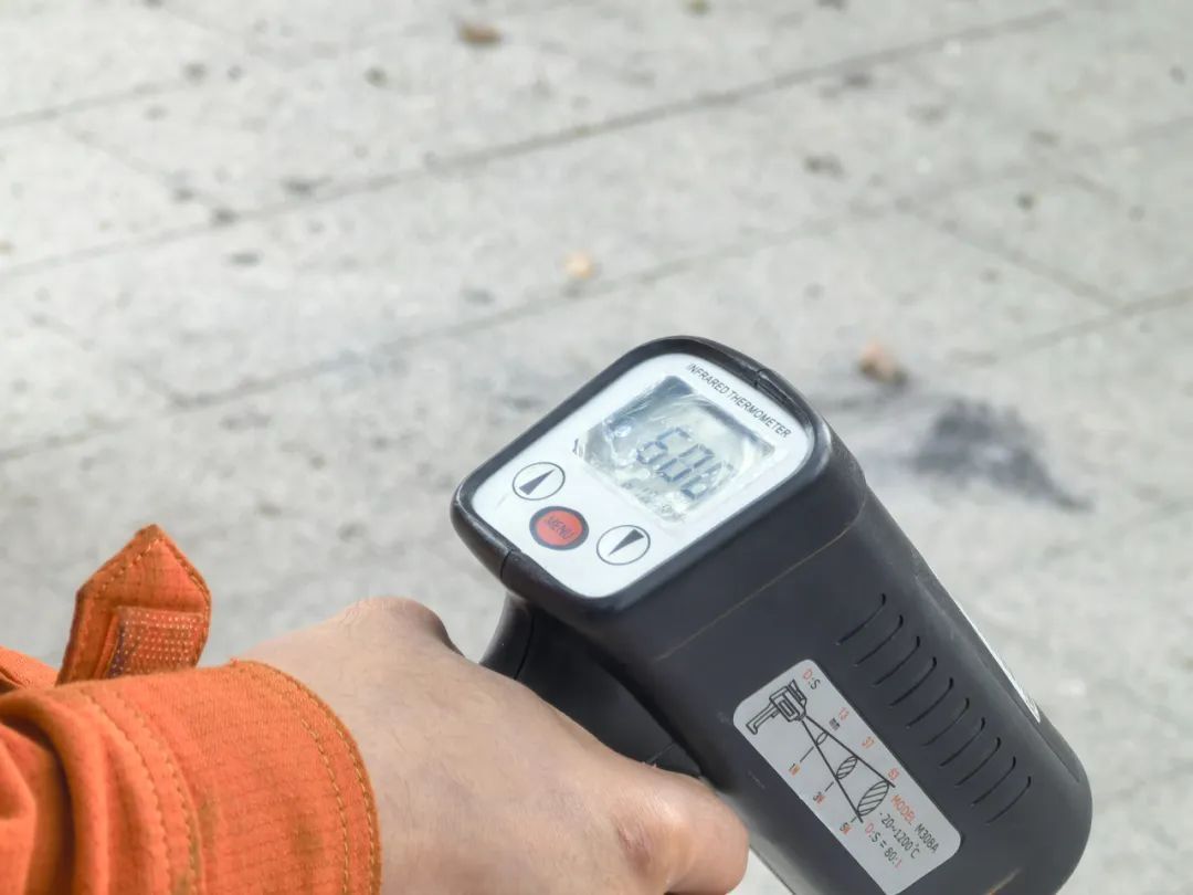 见状,消防员迅速拿起一旁准备好的灭火毯,覆盖在火盆之上。尽管火势被压制,但盆内仍有大量烟雾散出。此时,消防人员再次使用温度仪测量,发现燃尽后的灰烬温度仍维持在三四百度。