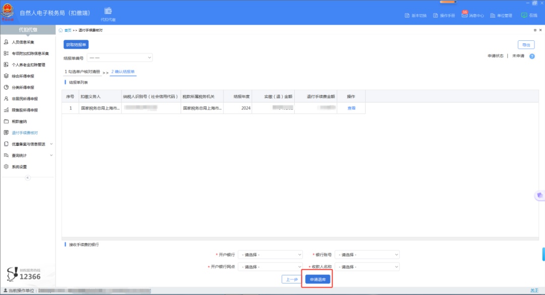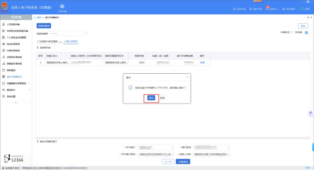 核对接收手续费的银行信息,依次选择“开户银行”、“银行账号”,点击【申请退库】→【提交】。完成后系统将推送至税务机关及国库审核,审核通过后,申请的手续费将退到扣缴义务人办理退付手续费时选择的银行账户内。