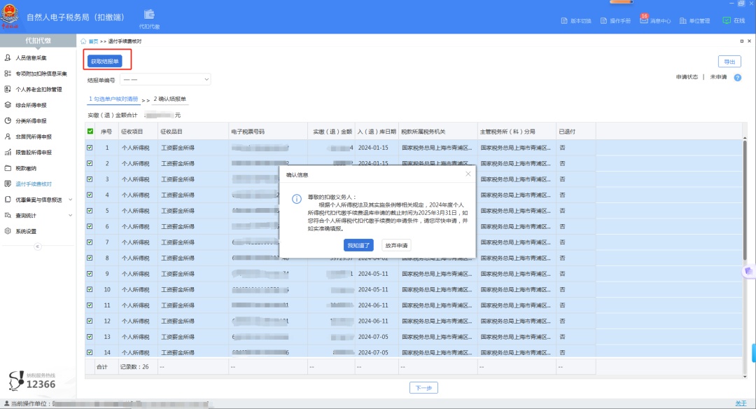 点击【获取结报单】,按钮获取“结报单”和“单户核对清册”系统自动带出2024年度扣缴明细。