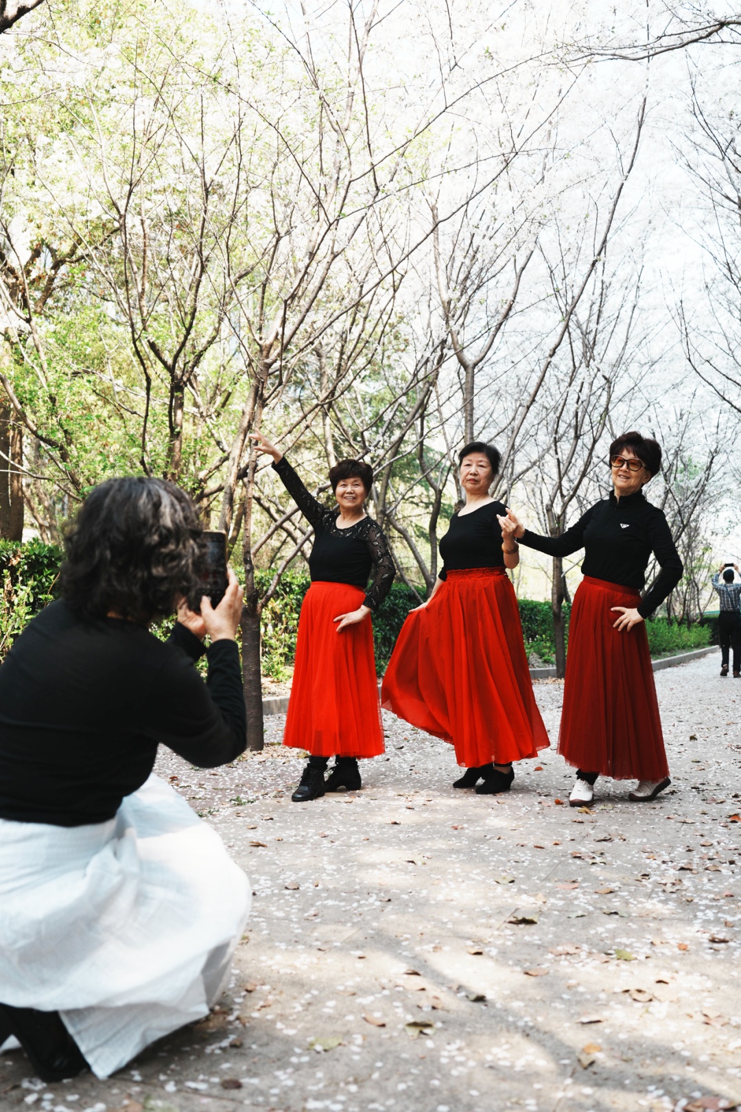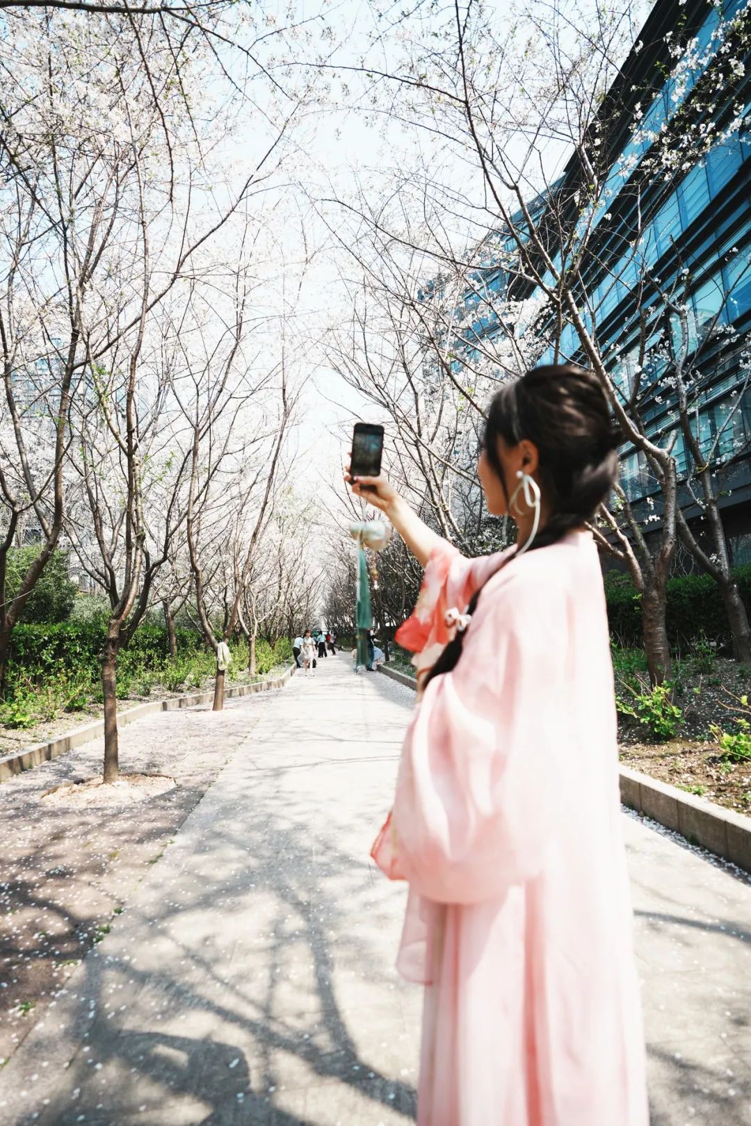 记者在现场看到,密集的花瓣飘落,营造出浪漫的氛围,吸引了不少市民慕名而来。有的特地身着汉服漫步其间,宛如穿越至古风画卷。还有的市民穿着红衣,在樱花的花雨中感受浪漫的春日。目前花径的樱花已进入全盛期,预计花期将持续至4月上旬。