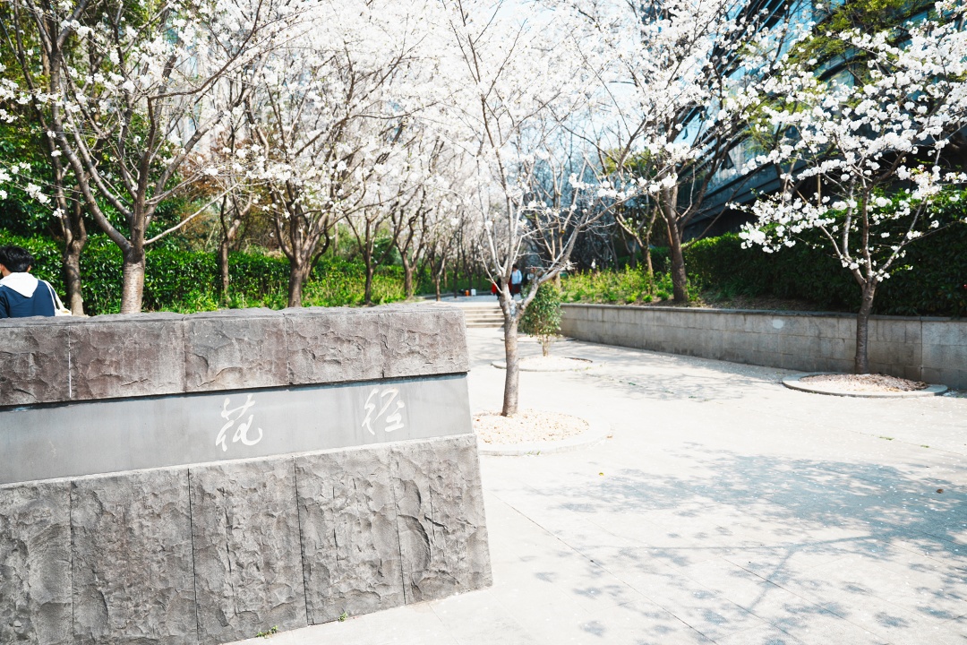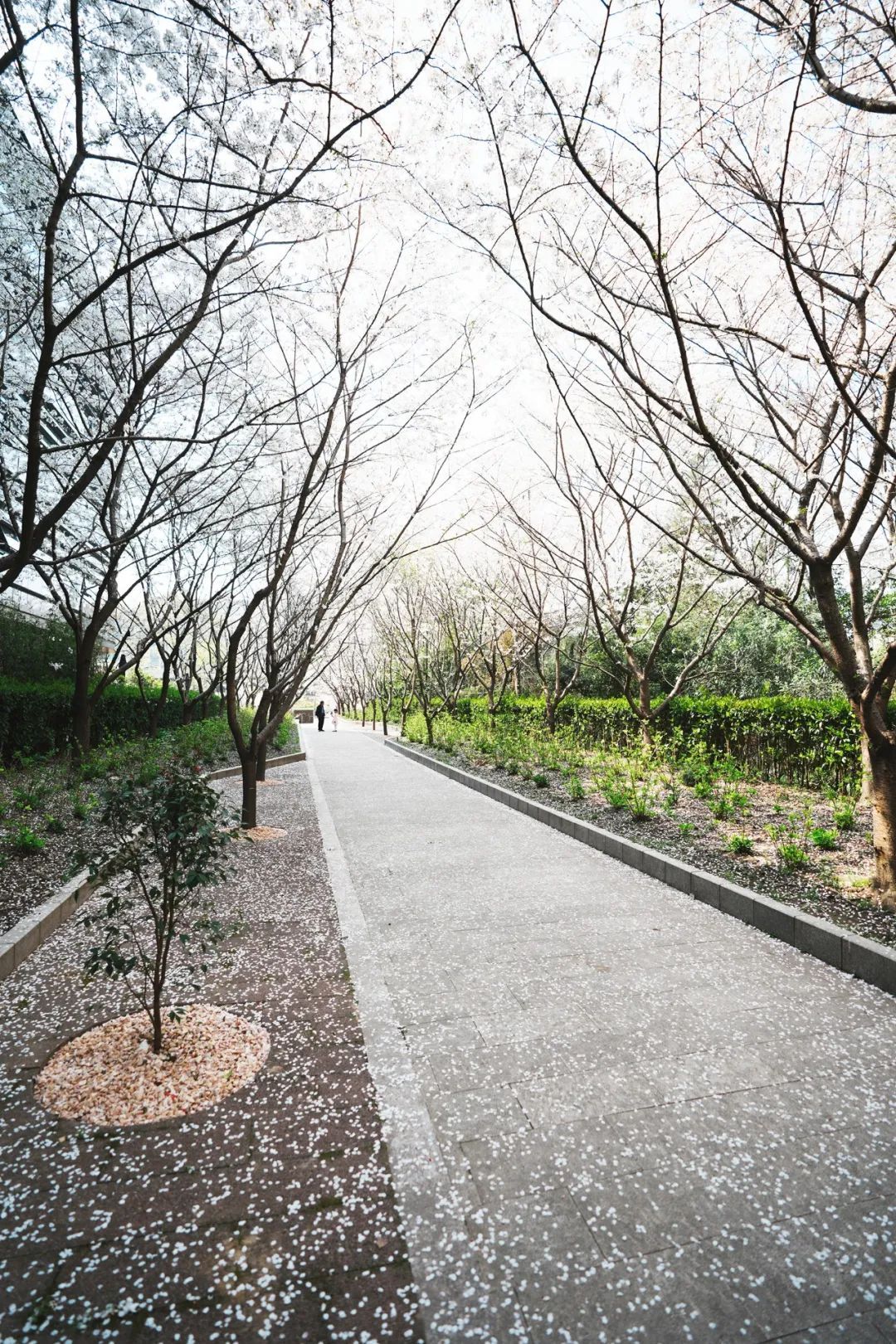 枝头繁花簇拥,微风拂过花瓣如雨飘落,简直就是让文学作品里的花雨具象化了。这里是光复西路靠近丹巴路的一处空地,在两栋商务楼中间,取名为花径。